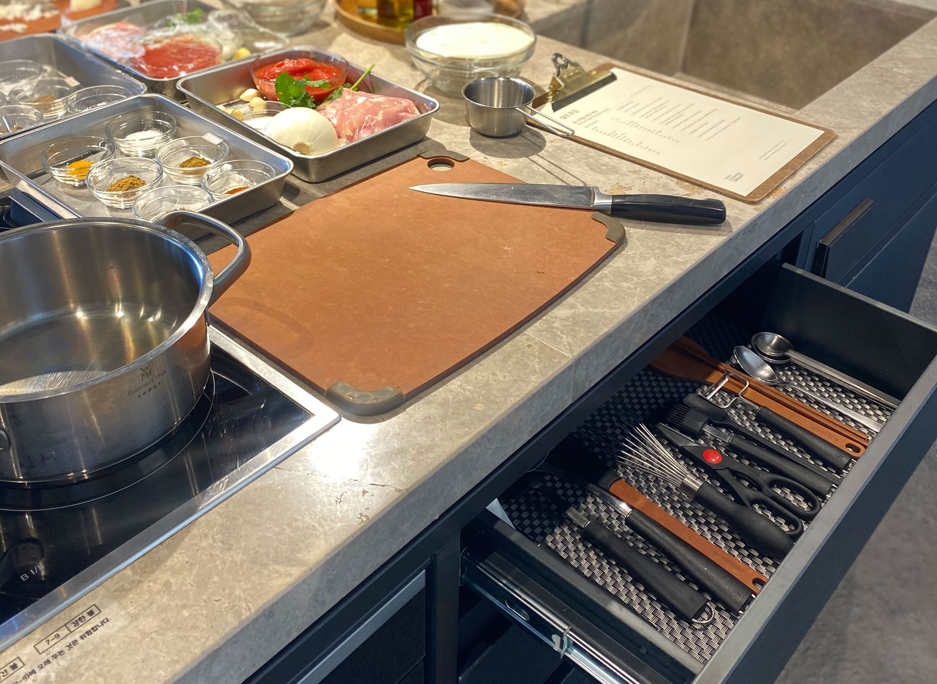 한 팀당 2명씩 요리를 함께 할 수도 있지만, 저는 1인으로 신청했기 때문에 제 주방은 혼자 사용했어요. 각 팀당 인덕션과 세면대는 물론 이렇게 서랍을 열면 정갈하게 요리에 필요한 모든 요리도구와 냄비, 프라이팬 등 주방 용품들이 구비되어 있습니다. 냄비와 프라이팬도 사이즈 별로 준비되어 있으니 요리 스타일에 따라 자유롭게 꺼내어 사용해도 좋아요.
