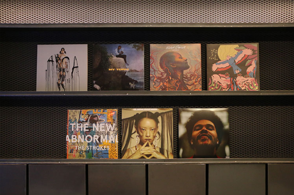 뮤직 라이브러리에서 추천하는 음악을 즐기는 재미도 있어요. 희귀 레코드판을 만나볼 수 있다는 특별함이 있죠. 원하는 곡을 서가에서 찾아 턴테이블에서 이용해도 되고, 희귀 앨범일 경우 DJ에게 신청곡을 작성하면 돼요.