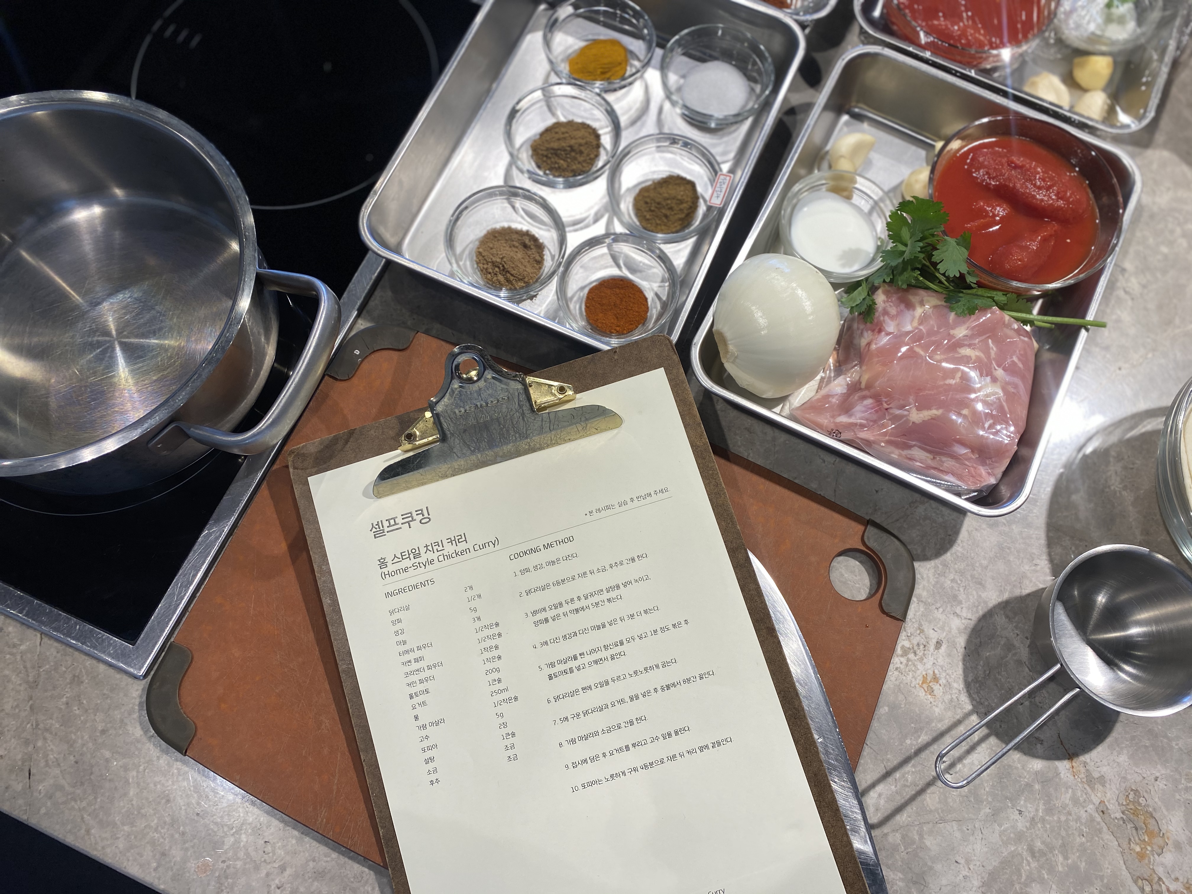셀프 쿠킹 메뉴는 ‘홈스타일 커리’ 였어요. 사진처럼 1인 조리에 필요한 재료가 모두 계량되어 있고, 양파와 홀토마토는 손질하기 쉽게 세척되어 있었어요. 치킨 커리이기 때문에 손질된 닭고기도 따로 소분되어 있었는데요. 요리를 좋아하지만, 재료 구매와 손질, 계량 등이 귀찮아서 선뜻 손이 가지 않는 분들도 많을 것 같아요. 쿠킹 라이브러리는 필요한 만큼 손질되어 있어 레시피를 따라 요리하고, 맛보기만 하면 되니 정말 편하고 감동적이더라구요.