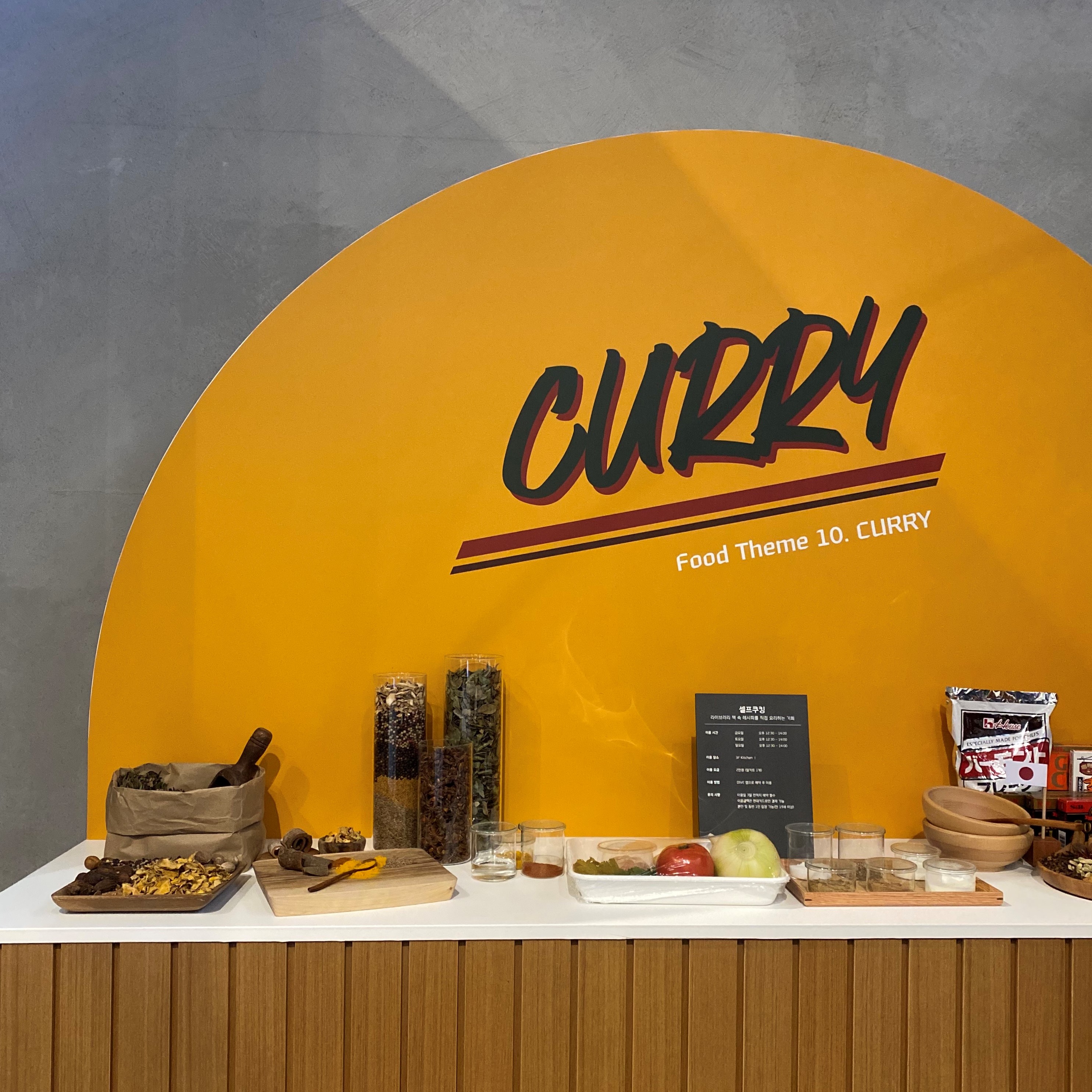 요리가 취미인 분들에게는 이만큼 좋은 공간이 없을 것 같아요. 현대카드 쿠킹 라이브러리는 매 시즌마다 테마로 하는 음식 주제가 바뀝니다. 커리, 토마토, 커피 등 다양한 재료를 메인 테마로 하고 있어요. 소개하는 음식의 컨셉도 바뀌고 주기적으로 진행하는 클래스의 요리 컨셉도 메인 재료에 따라 변경되는데요. 마침 가장 좋아하는 음식 중 하나인 커리가 메인 테마이길래 현대카드 다이브 어플을 통해 셀프 쿠킹 클래스를 예약했어요. 현대카드 라이브러리의 다양한 클래스와 전시 등은 다이브 어플을 통해 (현대카드가 없어도 가입하여 평일 이용 가능) 예약할 수 있어요.