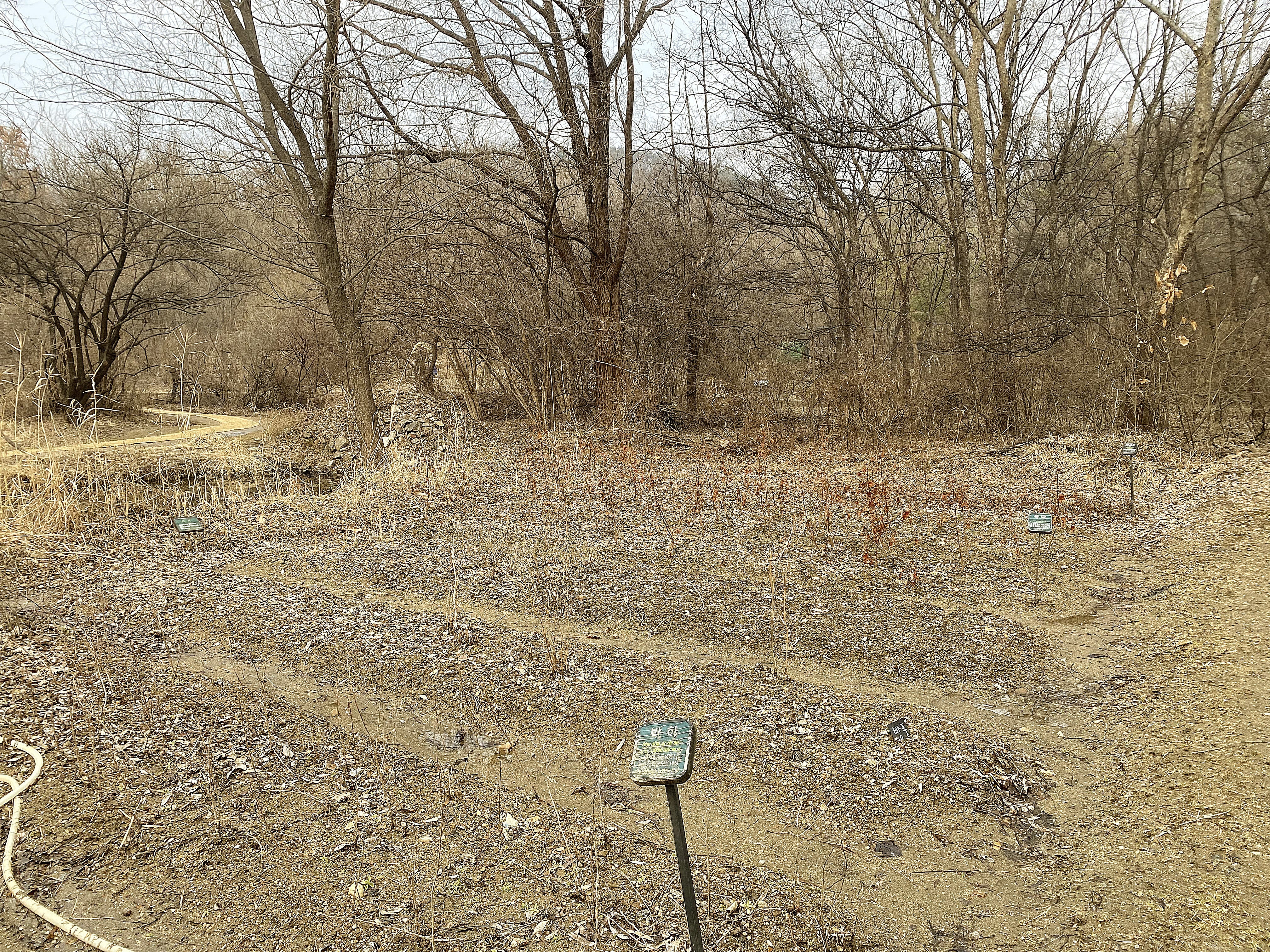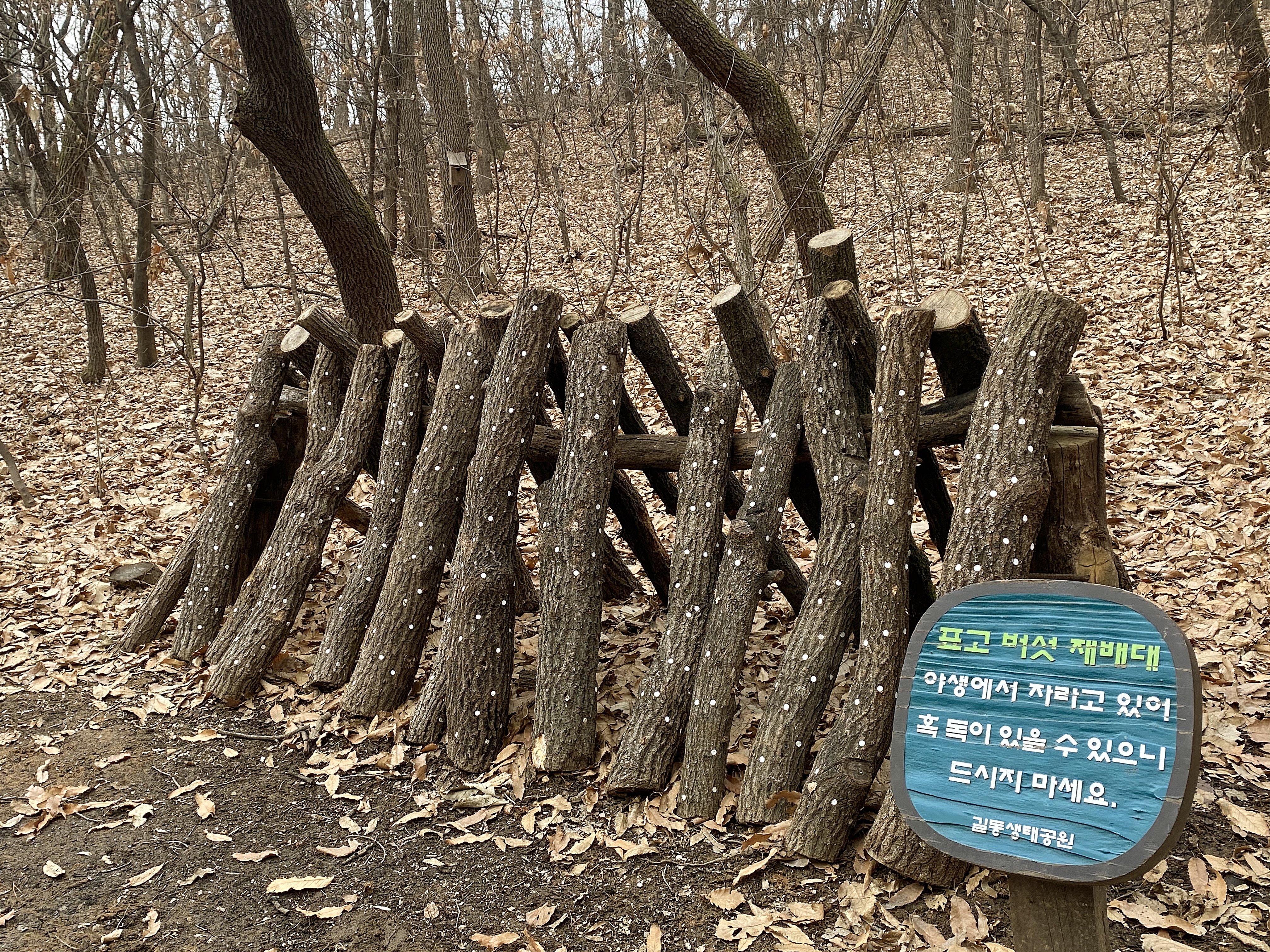 산림 지구를 따라 길을 걷다 보면 표고버섯 재배대도 볼 수 있습니다. 나무에 콕콕콕 박혀 있는 하얀 점이 표고버섯 종자입니다. 이렇게 버섯 종자를 나무에 박아두면 각 구멍에서 표고버섯이 자라나기 시작한답니다 :) 멈춰 있는 듯한 겨울이었지만, 다들 이렇게 열심히 봄을 맞을 준비가 한창이었어요. 따뜻한 계절에 방문하면 산림 지구에는 다양한 종류의 수목들은 물론이고 양지성 꽃과 음지성 꽃들을 모두 관찰할 수 있어요
