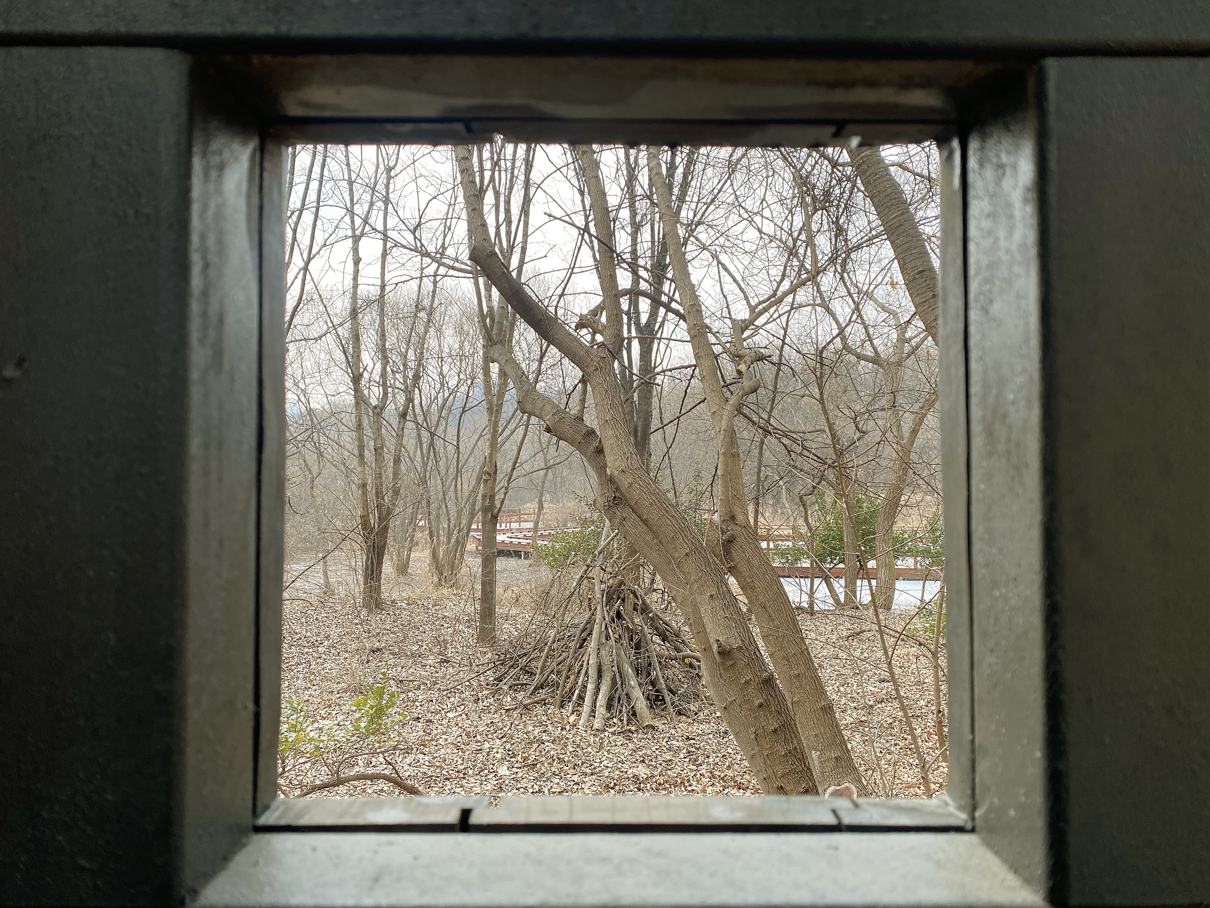 산림 지구 그리고 마주 보고 있는 농촌 지구에는 논병아리 못이 있는 저수지 지구를 가운데에 두고 조류관찰대가 마련되어 있습니다. 실제로 조류관찰대에서 까치로 보이는 새 한 마리를 발견했는데요. 이 조류관찰대에 있는 구멍 속으로 얼굴을 대고 살펴보면 운이 좋다면 물총새와 왜가리, 원앙, 흰뺨검둥오리, 중대백로 등을 관찰할 수 있습니다. 날이 풀려 얼음이 녹으면, 저수지로 나온 조류들을 관찰할 수 있겠죠?