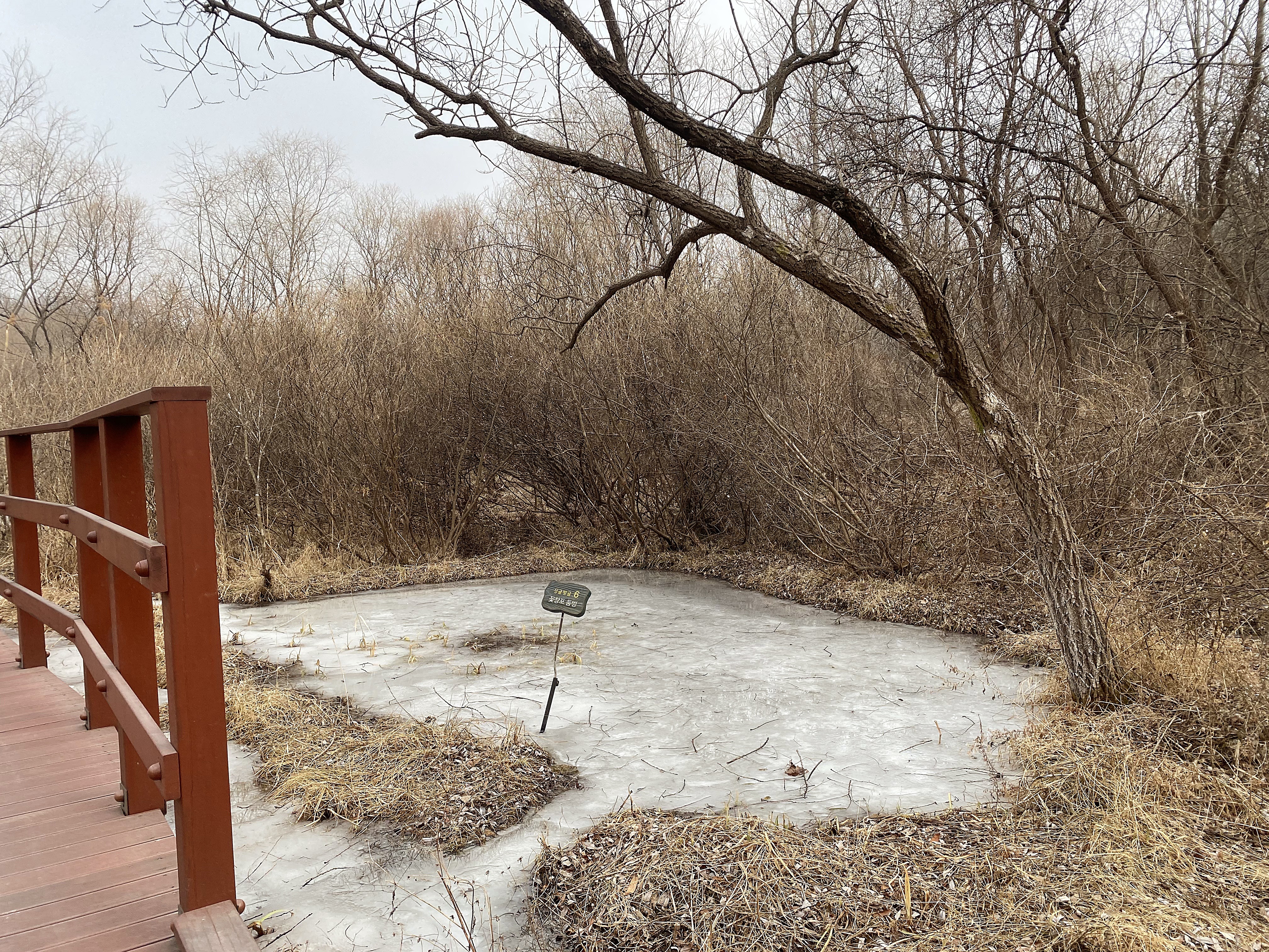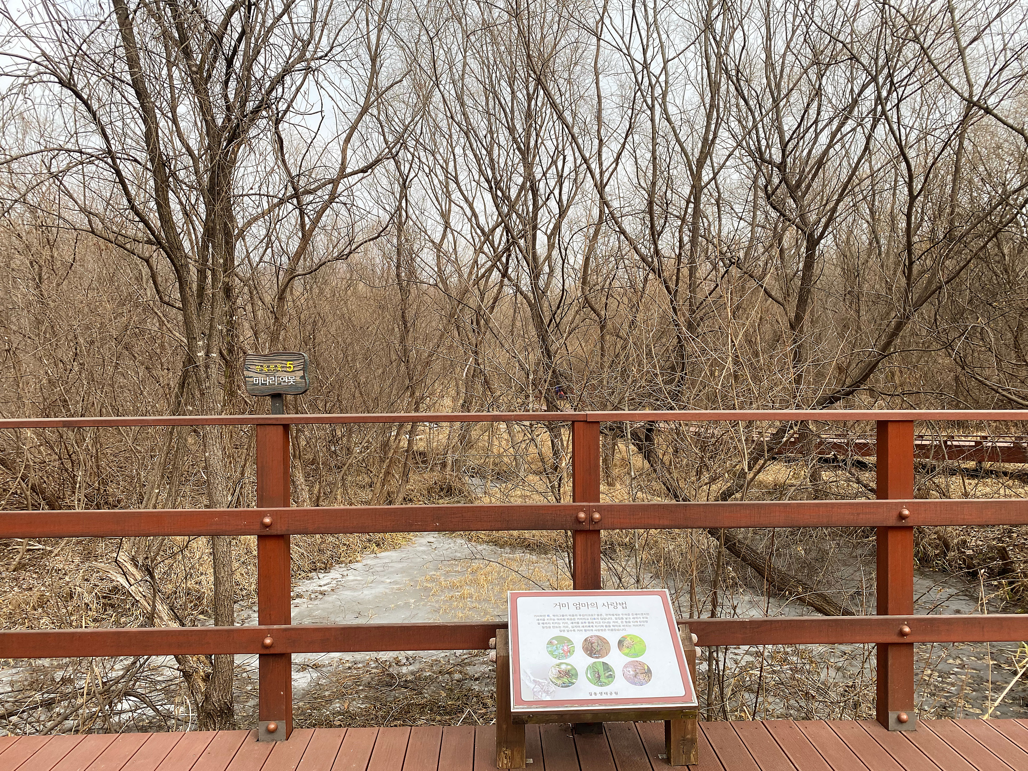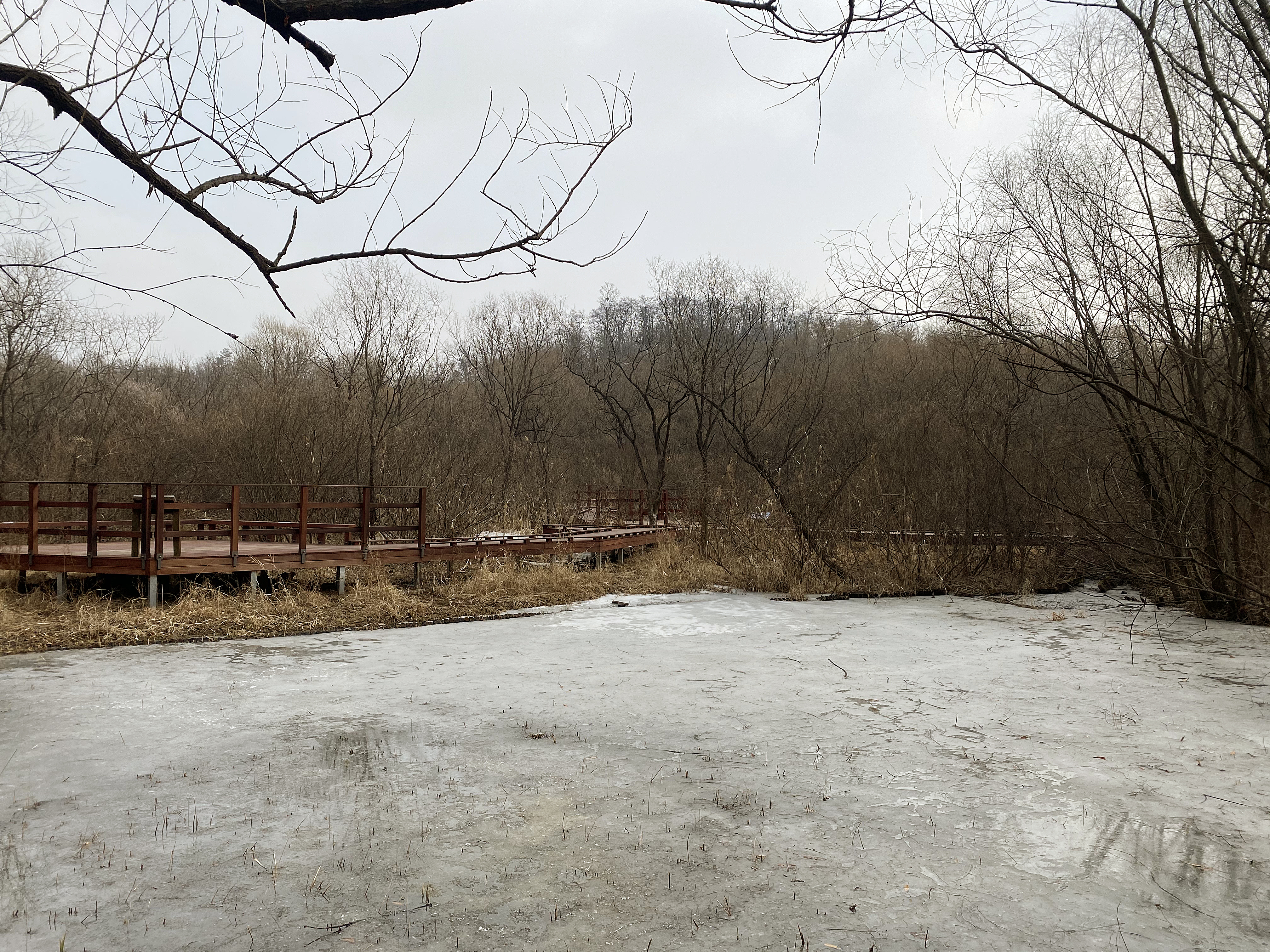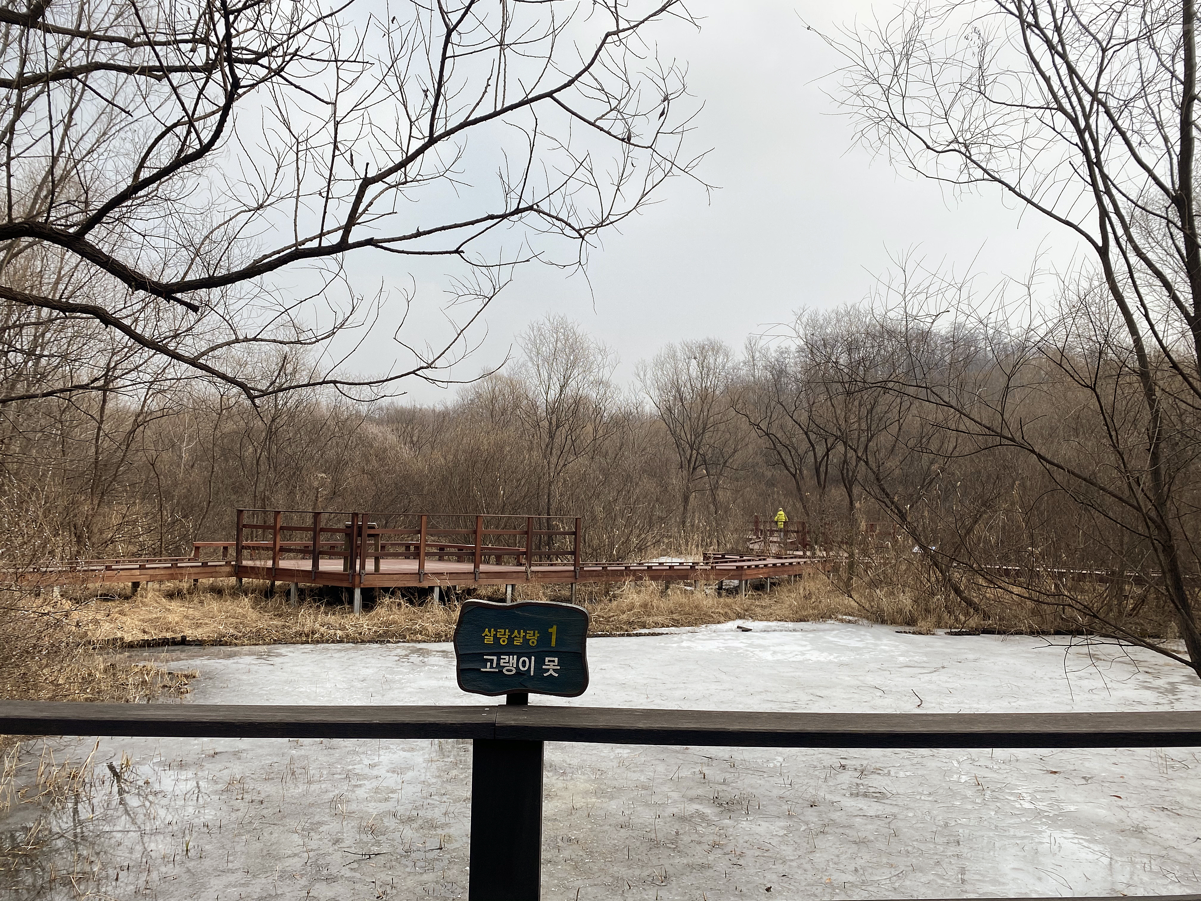 습지 지구는 추운 겨울이 지난 지 얼마 되지 않아 아직 이렇게 꽁꽁 얼어 있었어요. 많은 생명체가 서식할 수 있는 귀중한 생태 자원인 습지, 길동생태공원은 총 12개의 습지가 있어 도심에서 보기 힘든 다양한 동식물들을 만날 수 있는 곳입니다. 아무래도 봄여름보다 겨울이 아쉬운 건 추운 겨울, 따뜻한 곳으로 얼음 밑으로 꼭꼭 숨어 있는 생물들을 관찰하기 힘들다는 점이겠죠?