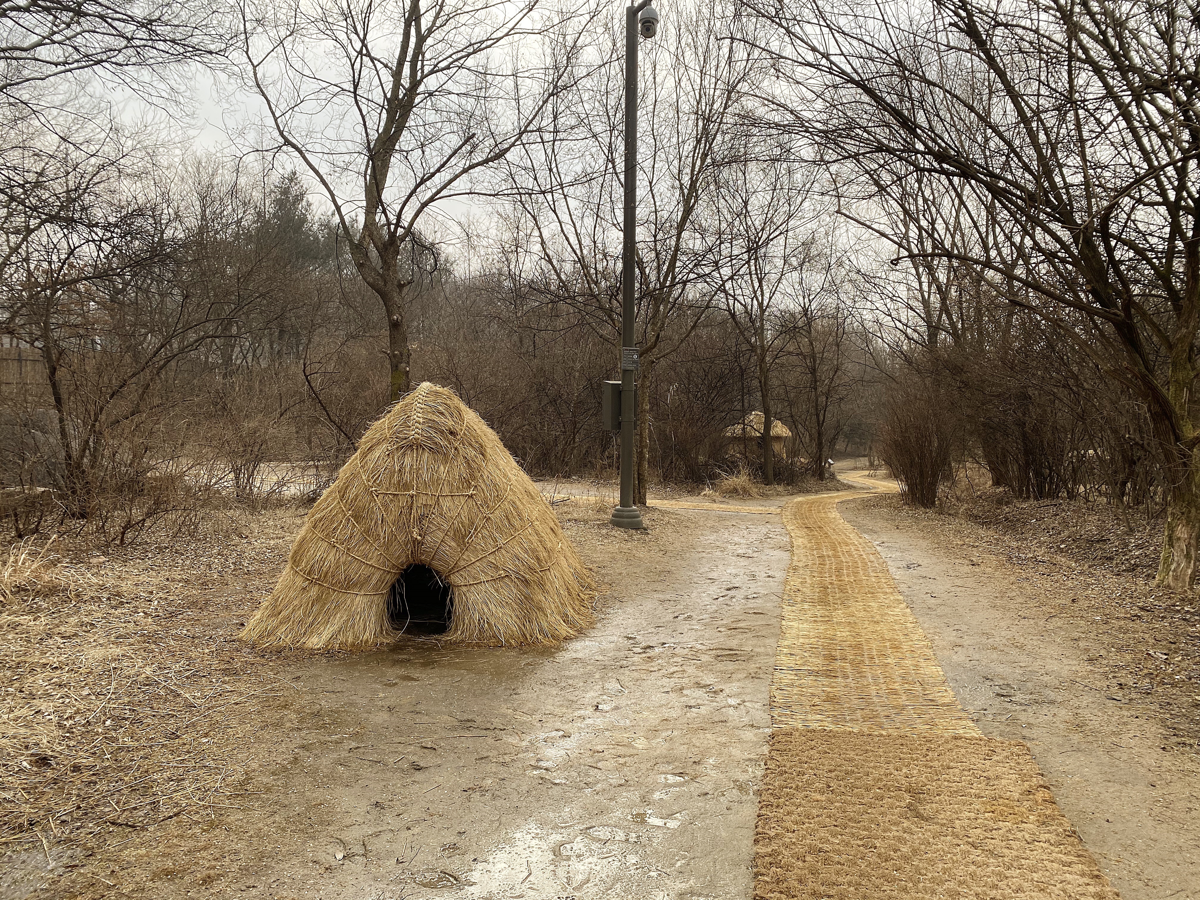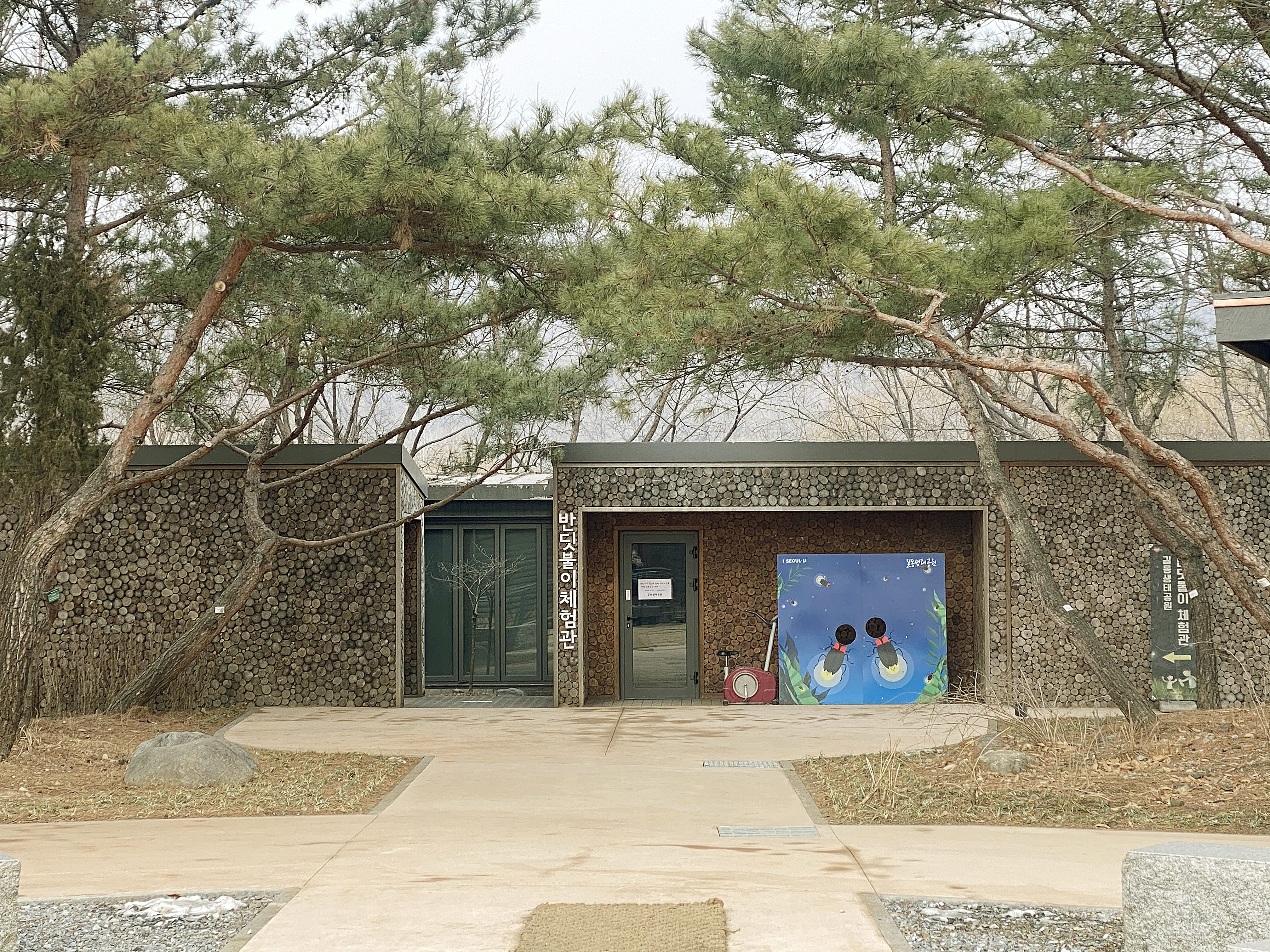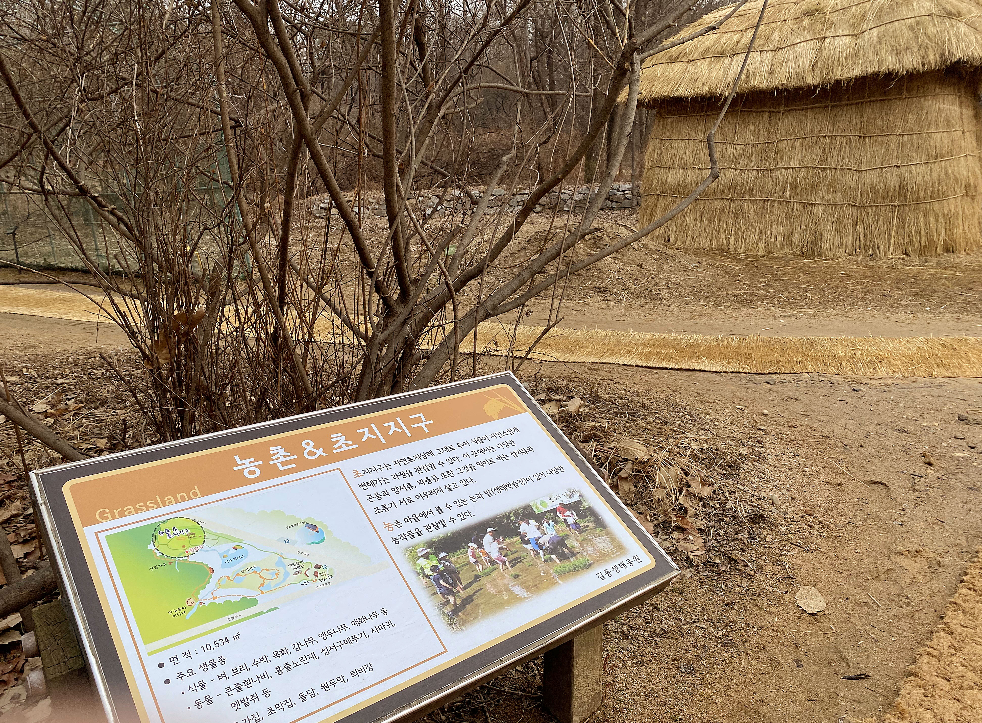 저수지 지구를 두고 산림 지구가 끝나는 지점쯤 반딧불이를 관찰할 수 있는 공간이 있습니다. 오전시간이라 반딧불이 관찰은 어려워 아쉬운 마음이 컸어요. 반딧불이 관찰 공간을 기점으로 다시 초입으로 돌아내려가는 길이 펼쳐지죠. 이 산림 지구의 반대편에는 농촌 체험 학습장이 있는 농촌&초지 지구가 위치해 있어요. 농촌&초지지구에서는 초가집, 움집, 돌담, 텃밭 등의 농촌 풍경과 함께 지렁이, 노린재, 거미 등을 관찰할 수 있어요. 추운 겨울, 볏집으로 만들어진 토굴과 움집에 곤충과 동물들이 추위를 피하고 있을 것 같죠?