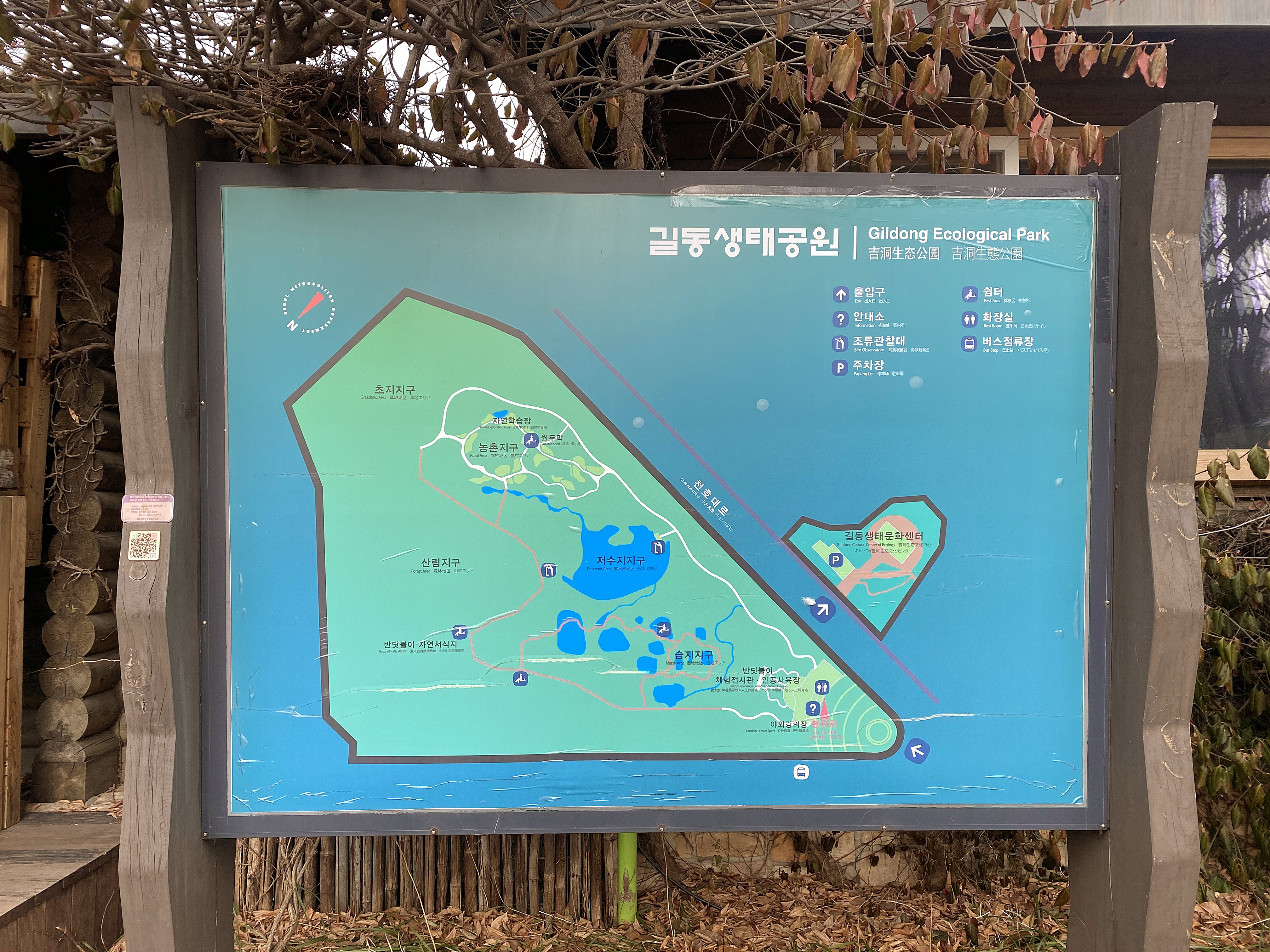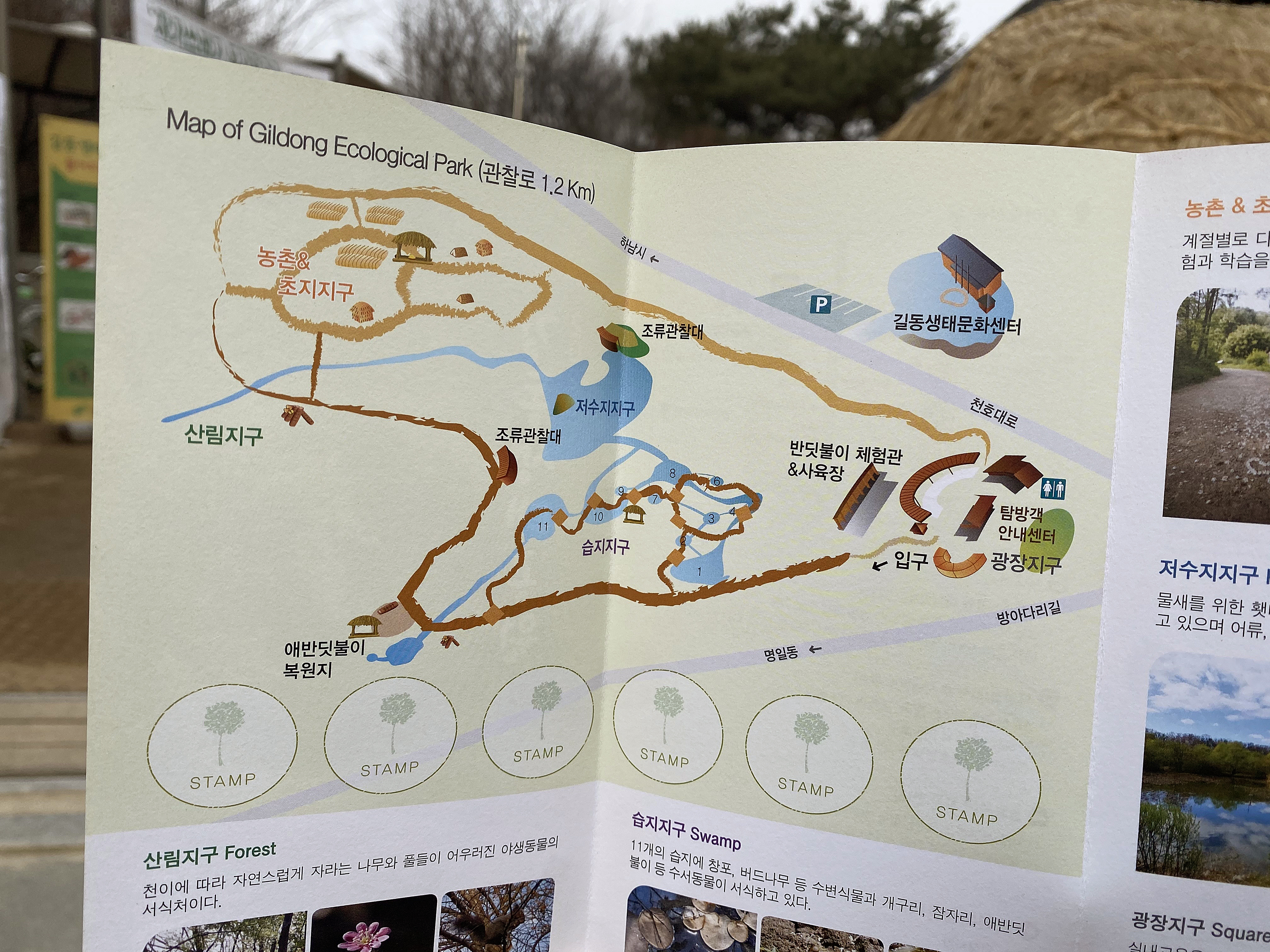 안내데스크에서 작은 안내 책자를 받을 수 있습니다. 안내 책자에는 길동생태공원 내부 지도와 각 지구 별 설명들이 기재되어 있어요. 지구는 각각 산림 지구, 습지 지구, 농촌 지구 그리고 저수지 지구, 광장 지구로 이루어져 있습니다. 표지판을 따라 걷다 보면 중간 지점들에 스탬프가 숨겨져 있었어요. 혹시나 아이들과 함께 방문 예정이거나, 스탬프 투어를 즐기시는 분이시라면 안내 책자 한 장 챙겨서 산책을 하셔도 좋겠죠?