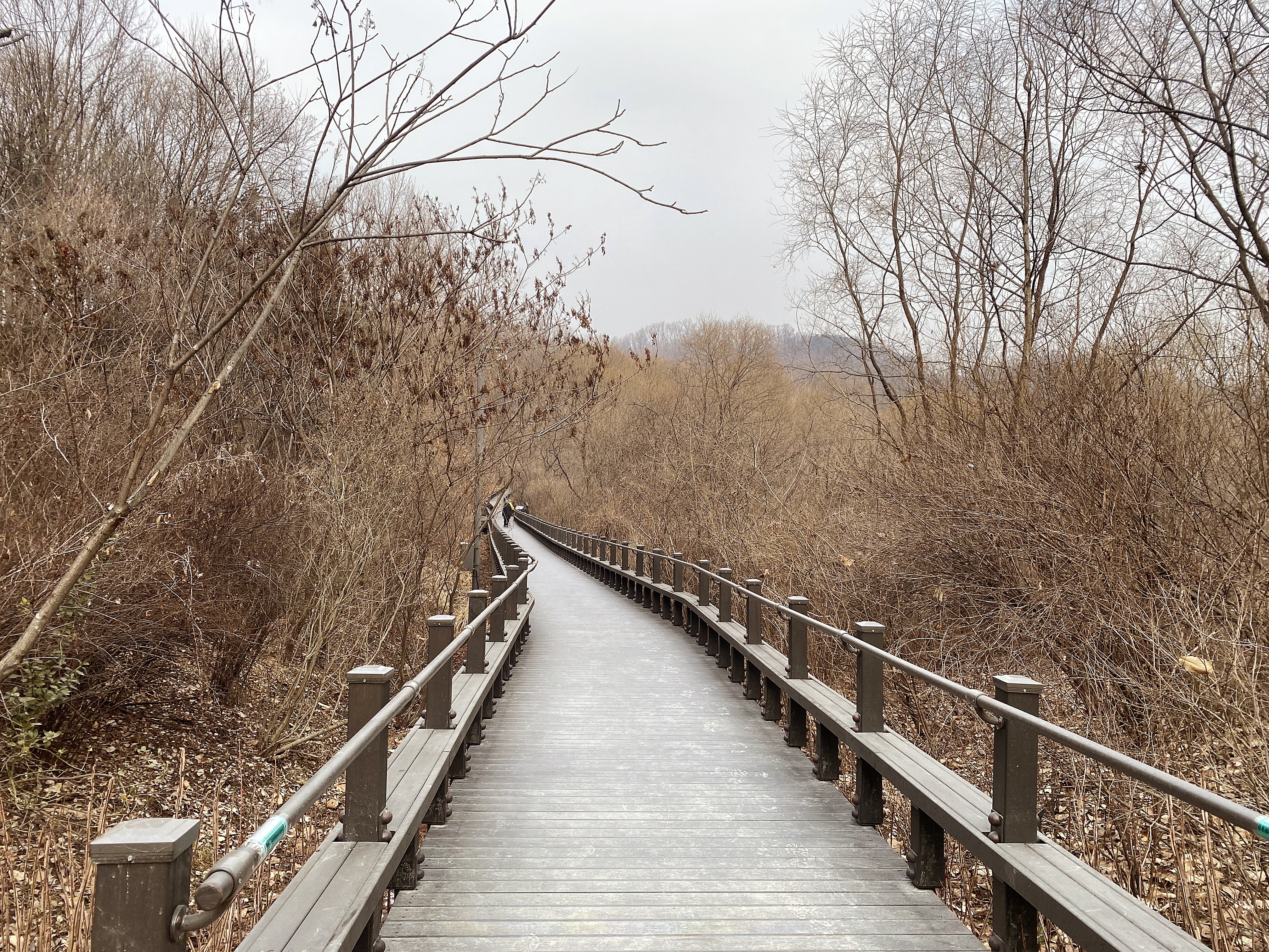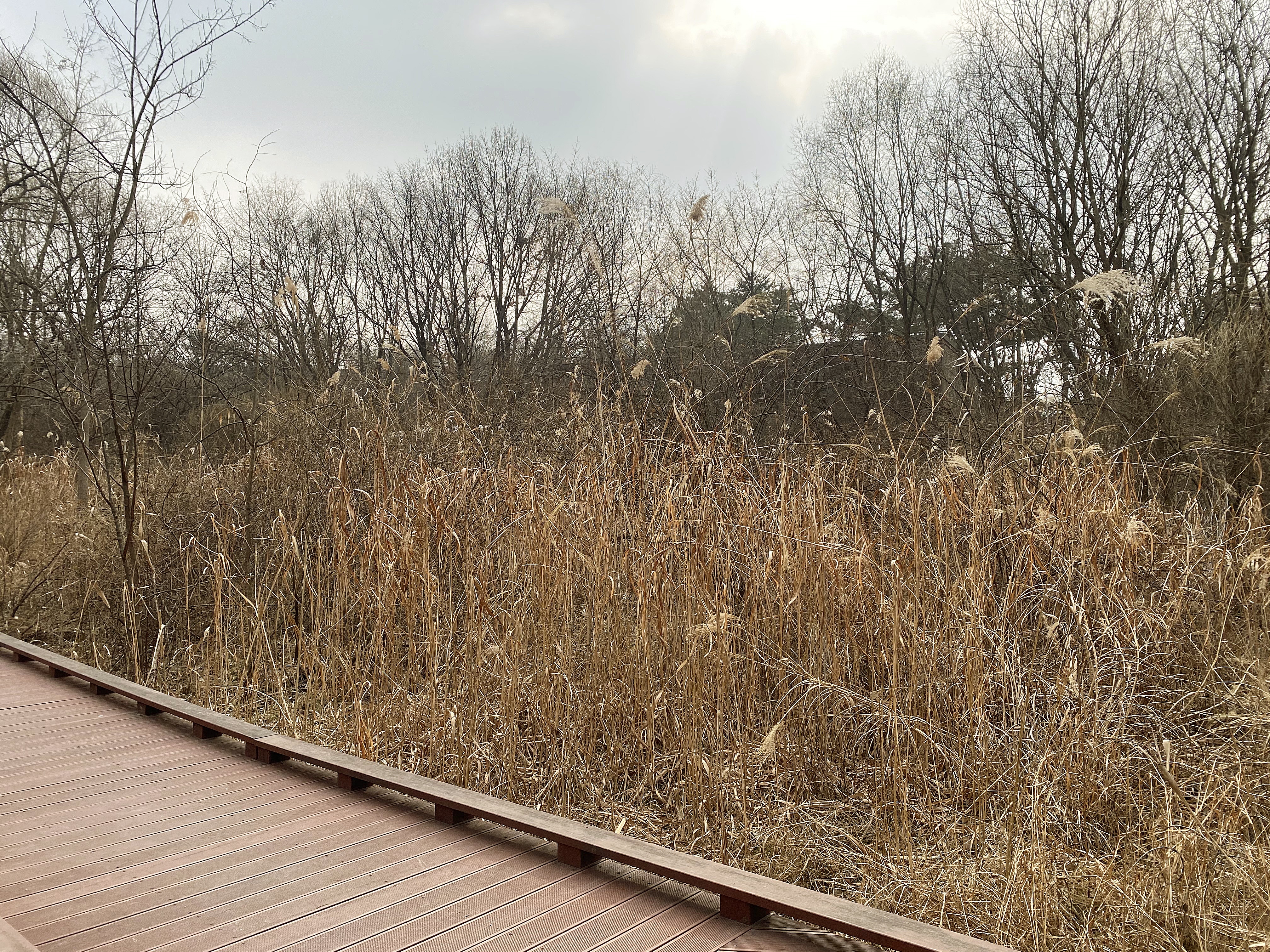 습지 지구에는 습지에 사는 다양한 생물들의 설명이 팻말에 친절하게 붙어 있었지만, 아쉽게도 얼어 있어 발견하지 못하고 다시 산림 지구로 돌아왔어요. 가을-겨울 시기에 방문한 덕에 무성한 갈대도 볼 수 있었습니다. 길동생태공원은 서울시가 ‘공원녹지확충 5개년 계 획’의 일환으로 조성한 환경친화형 생태공원으로, 98년 준공된 길동생태공원에는 64종의 수목 31,846그루, 138종의 야생 초화류가 188,257포기가 자라고 있다고 합니다. 특히 습지에서는 수생식물과 수서곤충 등을 관찰할 수 있기 때문에, 얼음이 녹을 때쯤, 봄나들이로 한 번 더 방문해보는 것을 추천드립니다.