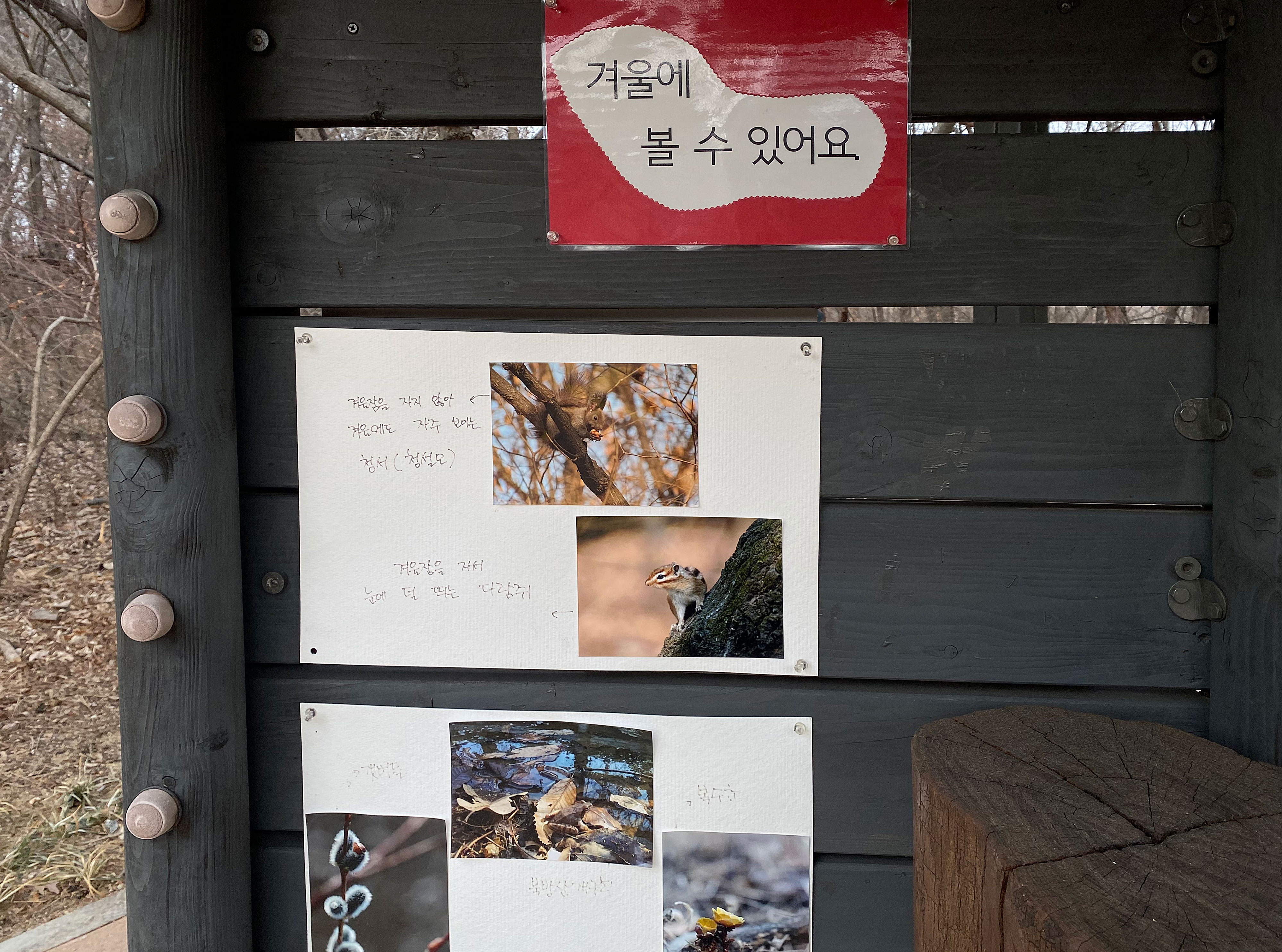가장 먼저 펼쳐지는 산림 지구에 들어가기에 전 위치한 게시판에는, 겨울에 볼 수 있는 여러 동식물의 흔적들을 직접 담은 사진들이 붙어 있습니다. 게시판 사진들을 먼저 확인하고 들어간다면, 각 지구를 탐방하면서 발견할 수 있는 생물들을 미리 확인할 수 있겠죠?