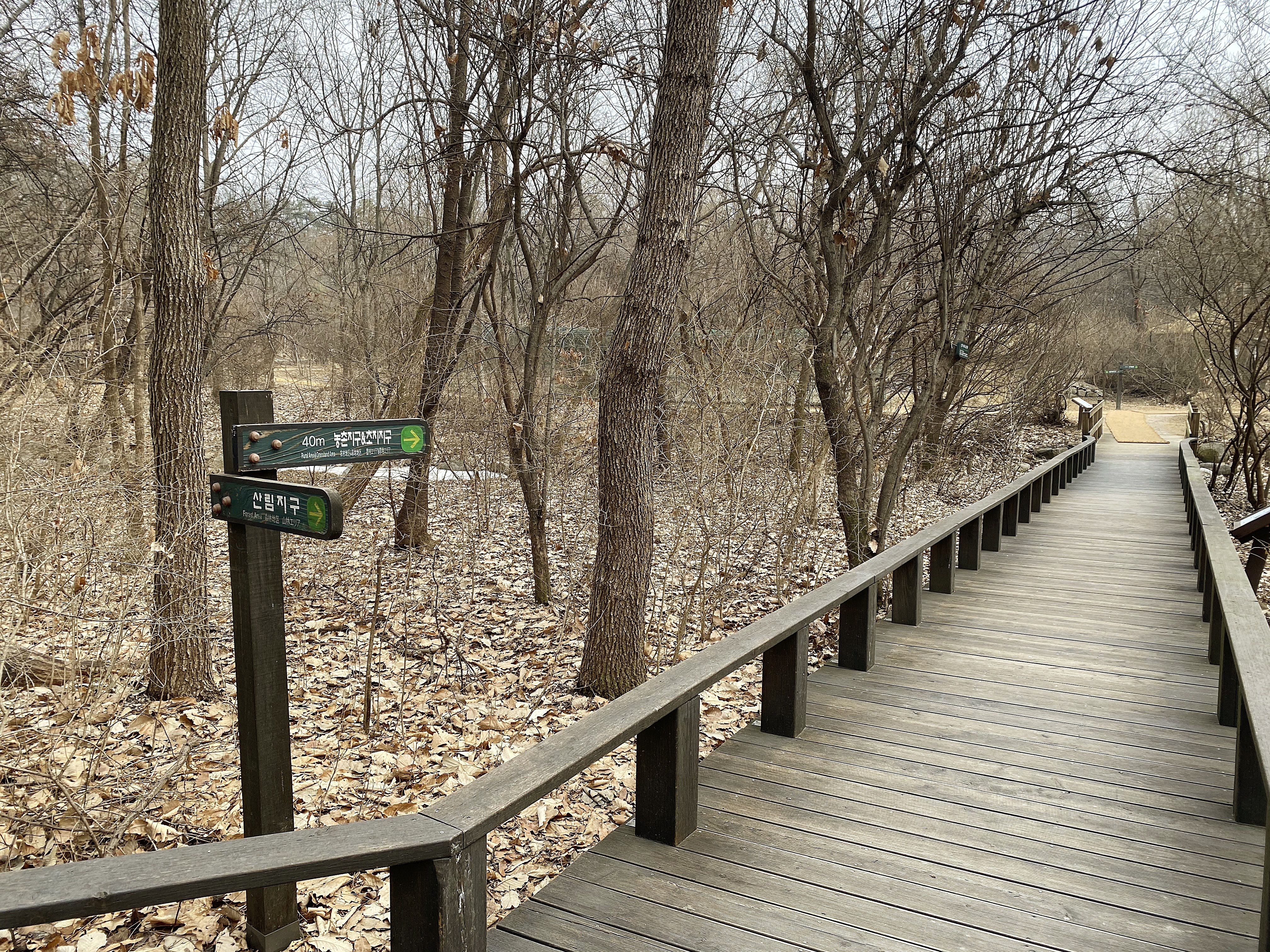 길동생태공원은 공원 전체적으로 산림 지구가 쭉 이어져 있는데 중간마다 습지 지구와 저수지 지구, 농촌 지구 등등으로 빠지는 샛길이 있는 형태로 이루어져 있습니다. 산림 지구에 마련된 길을 따라 걷다가 습지 지구 초입으로 빠져 한 바퀴 쭉 돌고 나오면, 다시 오던 방향 그대로 산림 지구를 거닐 수 있어요.