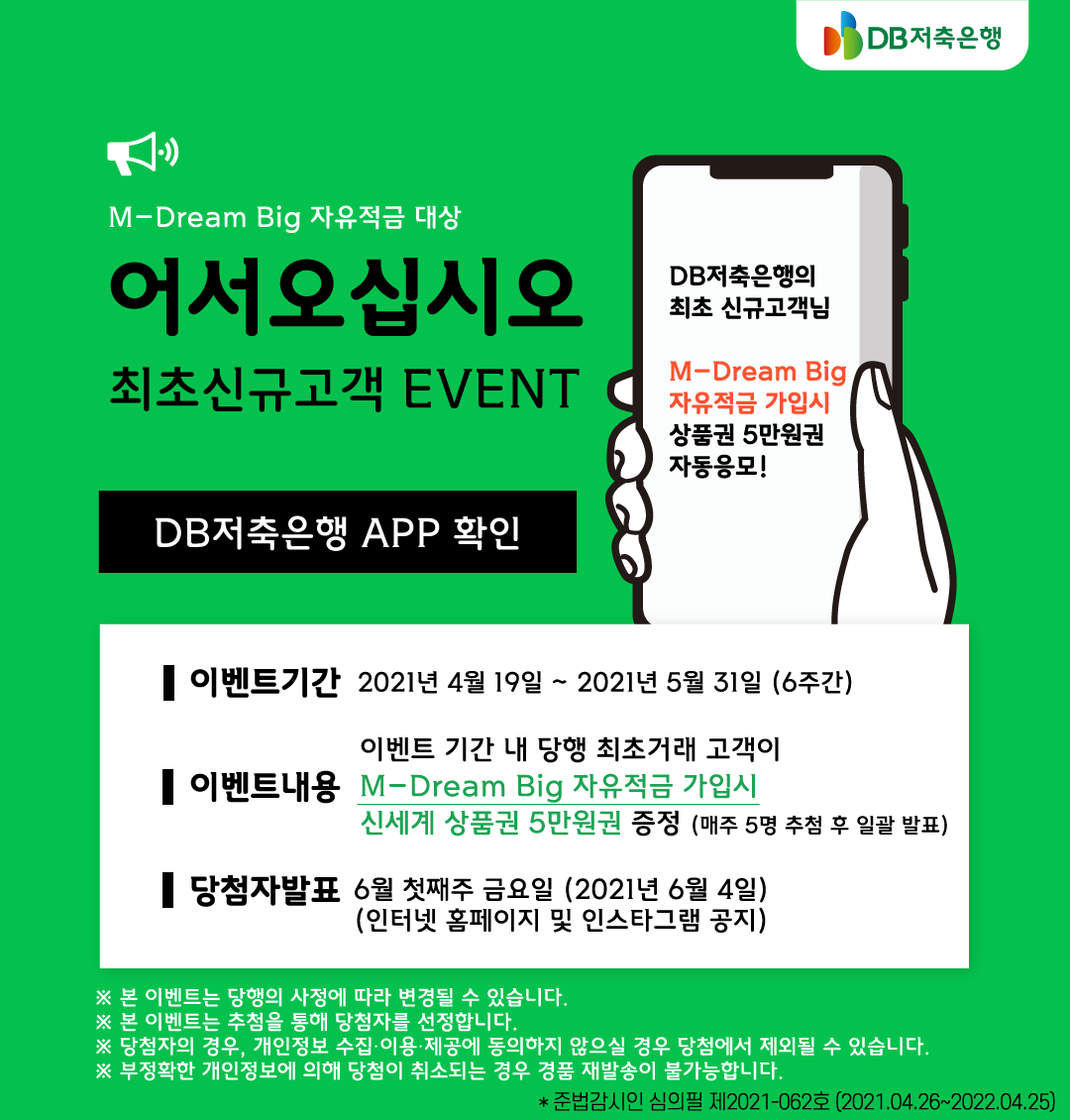 | DB저축은행, M-Dream Big 자유적금 매 1,000번째 고객님 골드바 1돈증정 이벤트 (0) | 2021.04.27 |