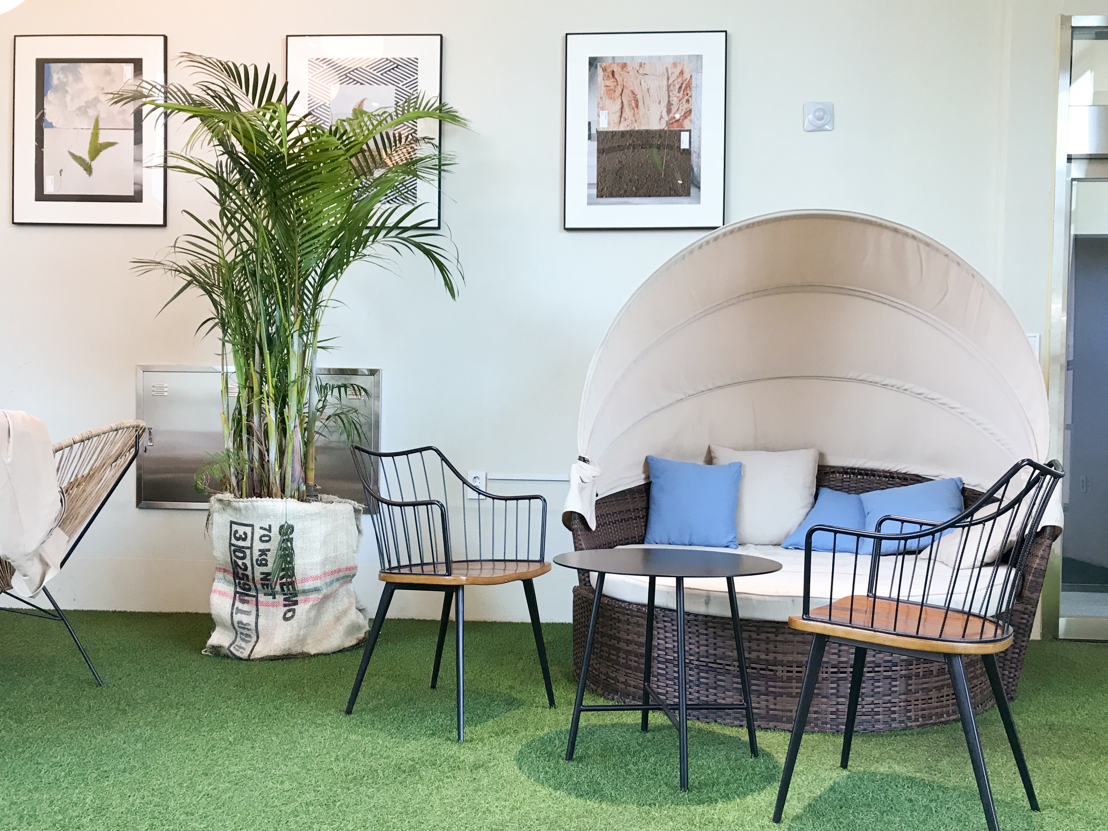 편안하게 머물 수 있는 자연스러운 공간은 앤드테라스의 정체성을 구성하는 가장 중요한 요소예요. 앤드테라스의 공간 디자인은 쉐도우메이커스에서 맡았습니다. 쉐도우메이커스는 커다란 내부 공간을 무엇으로 채워야 할지를 신중히 고민했답니다. 교외의 큰 창고처럼 보이는 건물 내부로 들어섰을 때 소소한 놀라움과 편안함을 주고 싶었죠. 그래서 외부 조경 보다 바깥의 자연을 이질감 없이 내부로 끌어들이는 데 집중하기로 했어요.