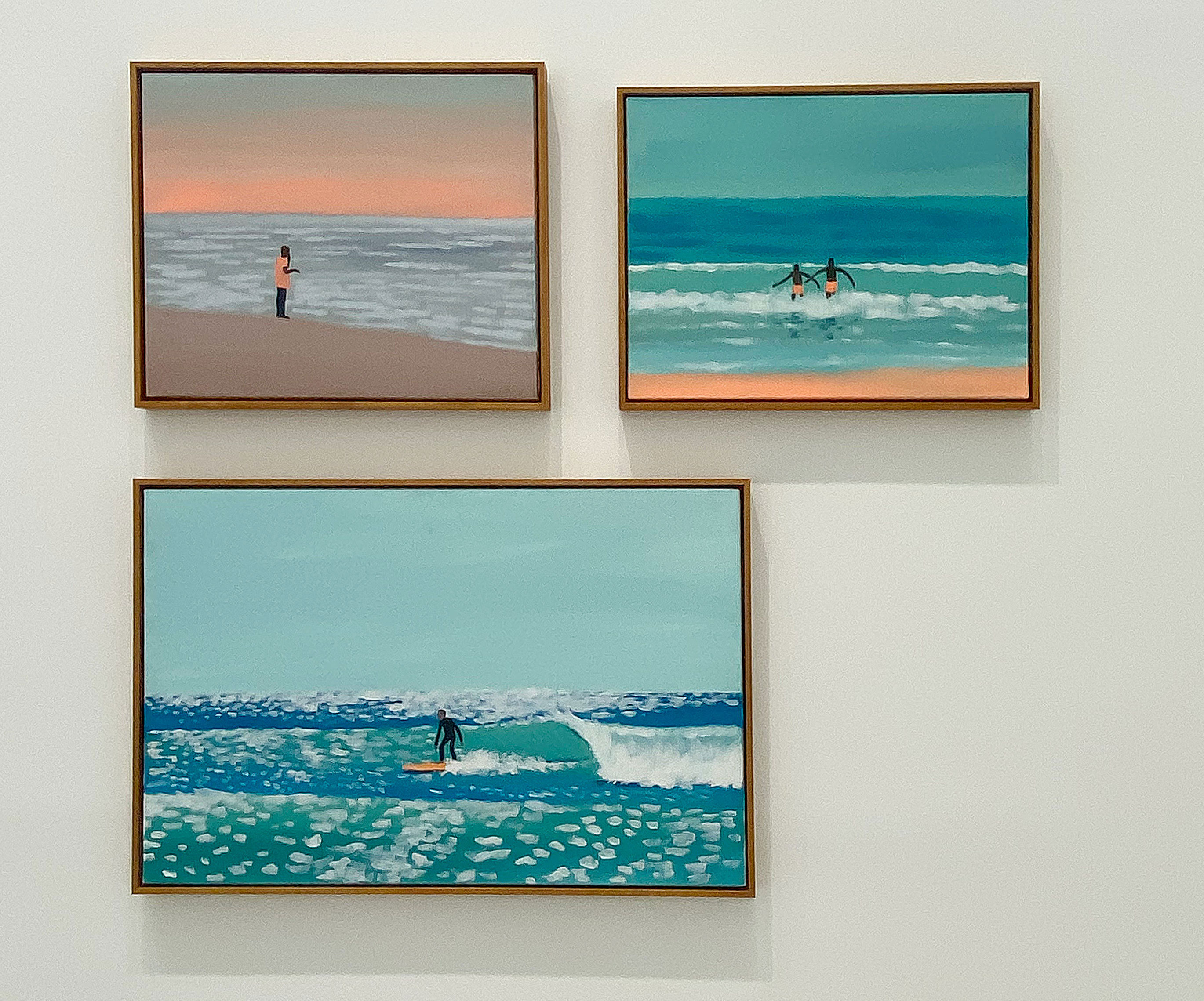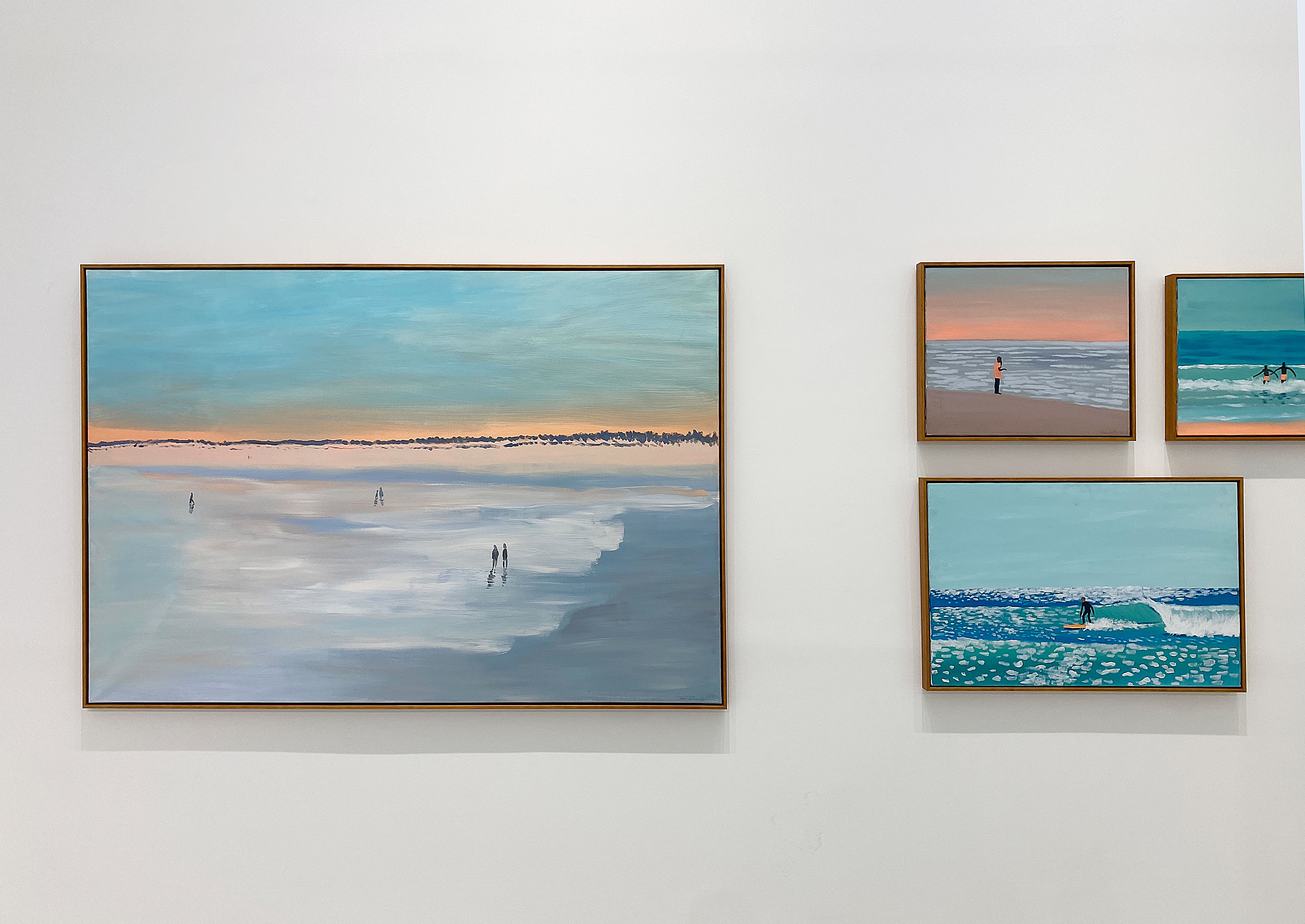 1층에서 2층으로 올라가는 계단에도 그의 작품이 전시돼 있습니다. 분홍빛 구름은 노을이 지기 시작하는 하늘을 표현한 것 같아요. 그의 작품은 서핑, 산책, 바다와 같이 소소한 일상에서 볼 수 있는 보통의 풍경들이 소재가 됩니다.