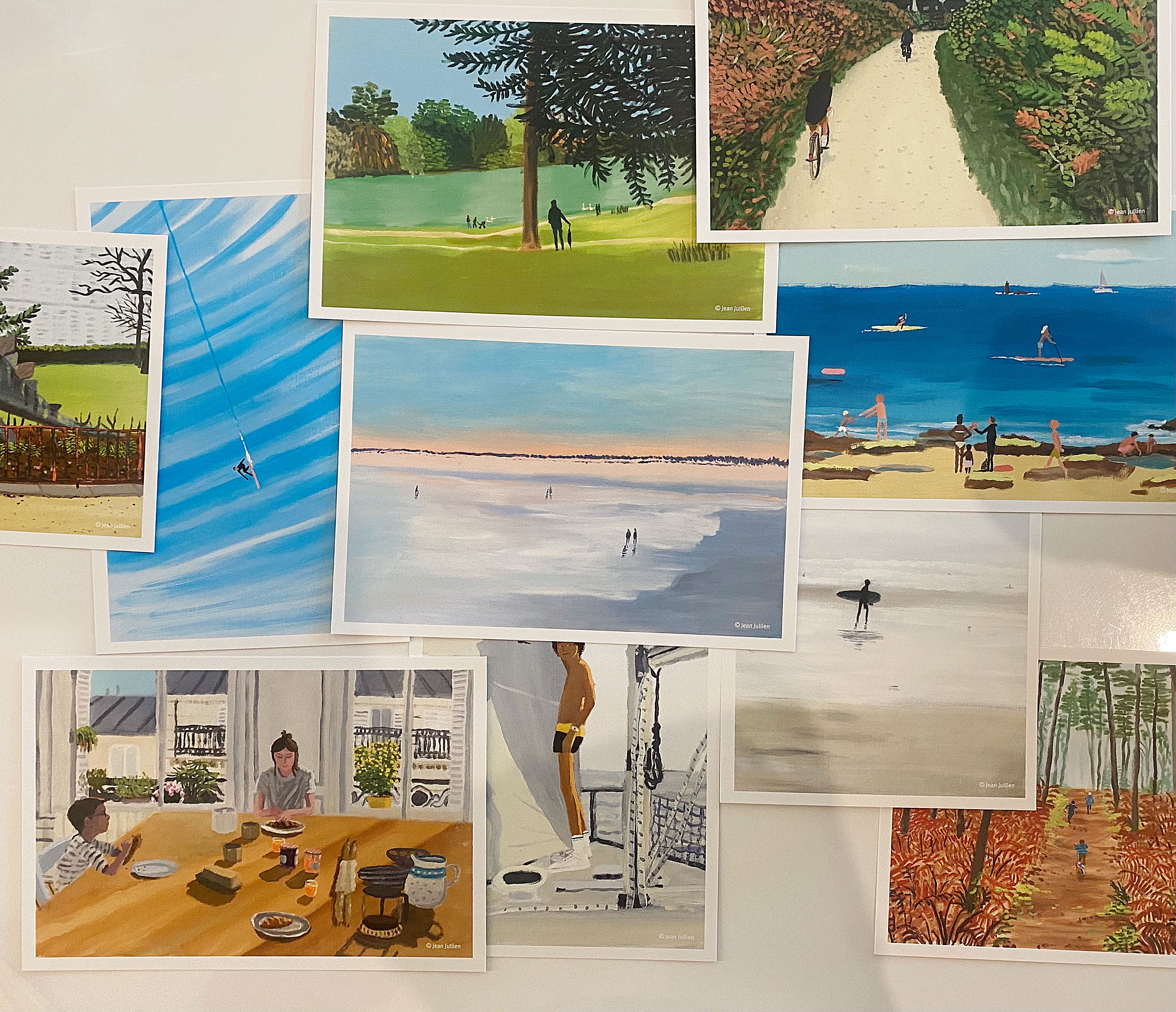 3층으로 올라가면 그간 장 줄리앙이 펴낸 책들과 이번 전시에서 만나본 페인팅 작품들의 엽서, 포스터 등을 만날 수 있습니다. 그의 일기장이나 다름없는 스케치 도안을 엮어낸 책도 있었어요. 마음에 쏙 들었던 작품들이 있다면 엽서 모음에 그림이 포함돼 있는지 확인해보세요. 세트당 총 5가지의 그림이 A, B세트로 구성되어 있답니다.