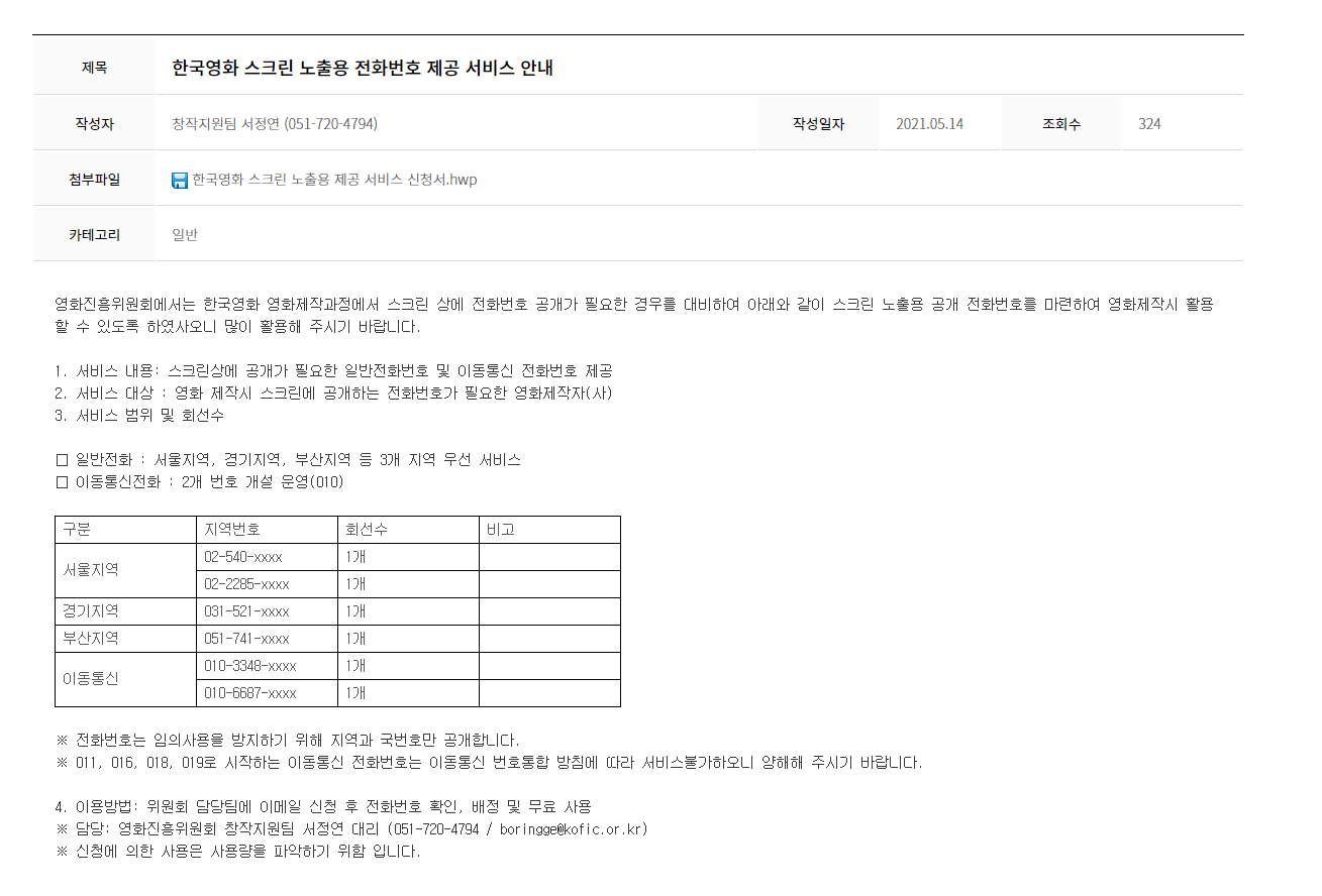 2011년부터는 최익환 감독의 아이디어로 영화진흥위원회(이하 ‘영진위’)에서 한국영화 스크린 노출용 전화번호 제공 서비스를 제공하게 되었어요. 즉 영진위에서 전화번호 몇 개를 장기 대여하고, 영화를 찍을 때 사용할 수 있도록 해주는 서비스가 제공되는 것이죠.