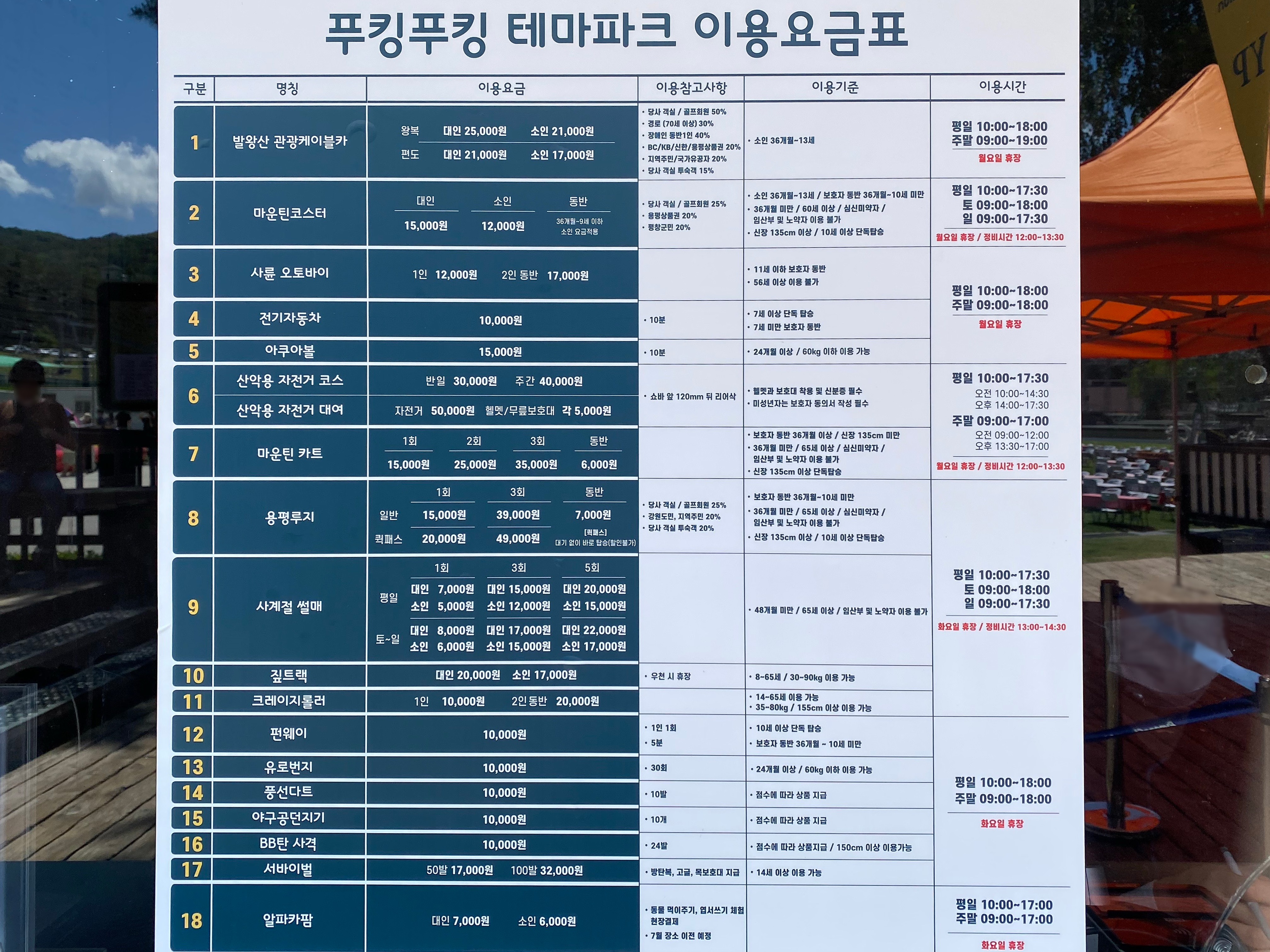 테마파크는 평일에 오전 10시, 주말에 오전 9시에 개장해요. 테마파크에 있는 놀이기구 중, 마운틴코스터 줄이 가장 길기 때문에 일찍 도착하면 마운틴코스터부터 타는 걸 추천드려요. 최소 9시 30분에는 도착해야 오래 기다리지 않고 탈 수 있다는 점!
