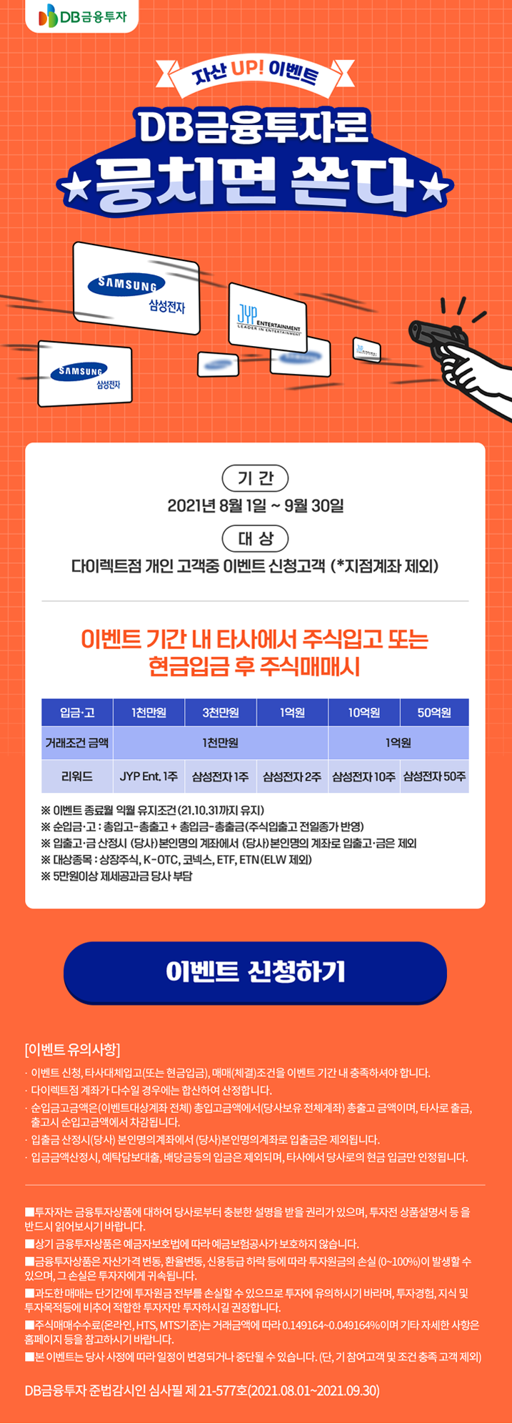 | 리워드 | JYP Ent. 1주 | 삼성전자 1주 | 삼성전자 2주 | 삼성전자 10주 | 삼성전자 50주 |