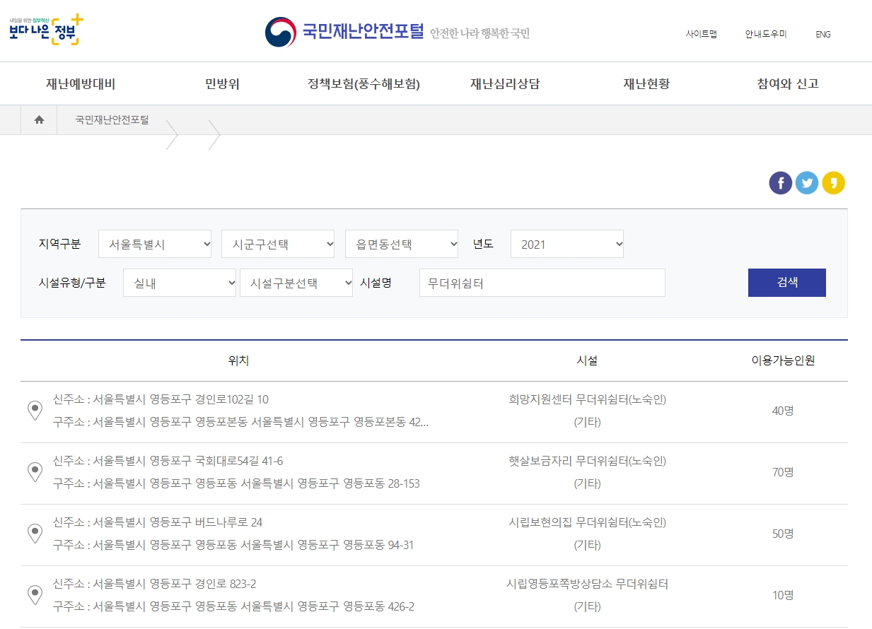 21년 3월 기준 실내 무더위 쉼터 현황을 살펴보면, 서울 3,727개, 경기 7,418개 등 전국 총 50,960개의 무더위 쉼터가 운영되고 있어요. 무더위 쉼터는 안전디딤돌 앱, 국민재난안전포털 홈페이지 등에서 확인할 수 있으며 평소에 위치를 미리 확인해 두는 것이 좋아요.