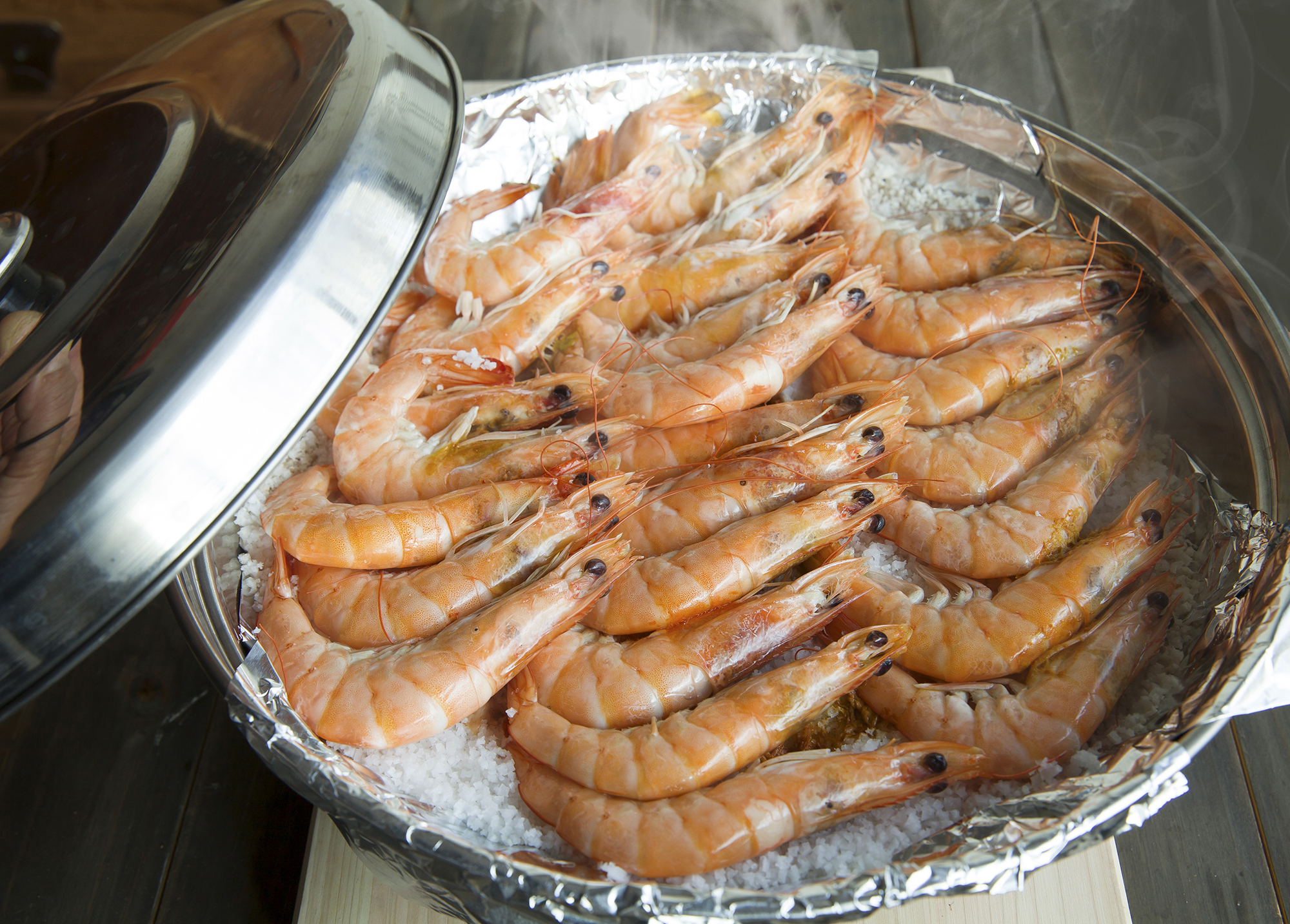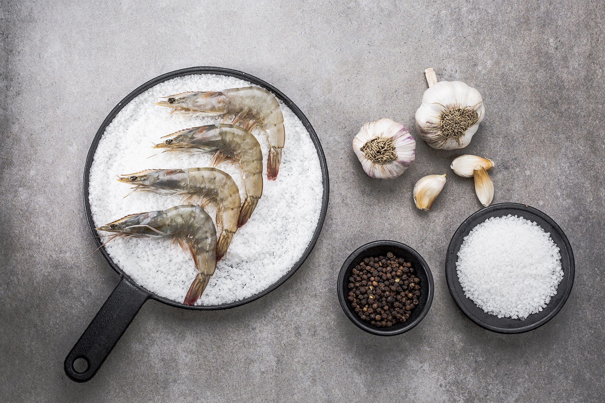 싱싱한 새우는 불만 쪼여도 맛있어요. 솜씨는 부엌 밖에 두고 요리해도 된다는 말이죠. 가족이 둘러앉아 함께 먹기 좋은 건 소금구이가 좋습니다. 껍질이 있다면 가볍게 헹구고 아이들이 먹다가 다칠 수 있으니 머리에 있는 단단한 뿔, 긴 더듬이나 수염, 꼬리에 있는 단단하고 뾰족한 물총은 가위로 잘라내세요. 새우 머리와 꼬리를 잡고 구부린 다음 등 쪽 2~3마디 정도에 꼬치를 관통해 쑥 들어 올리면 실처럼 생긴 회색의 내장도 빼낼 수 있어요. 싱싱한 새우를 완전하게 익혀 먹는 요리라 내장을 굳이 빼지 않아도 괜찮아요.