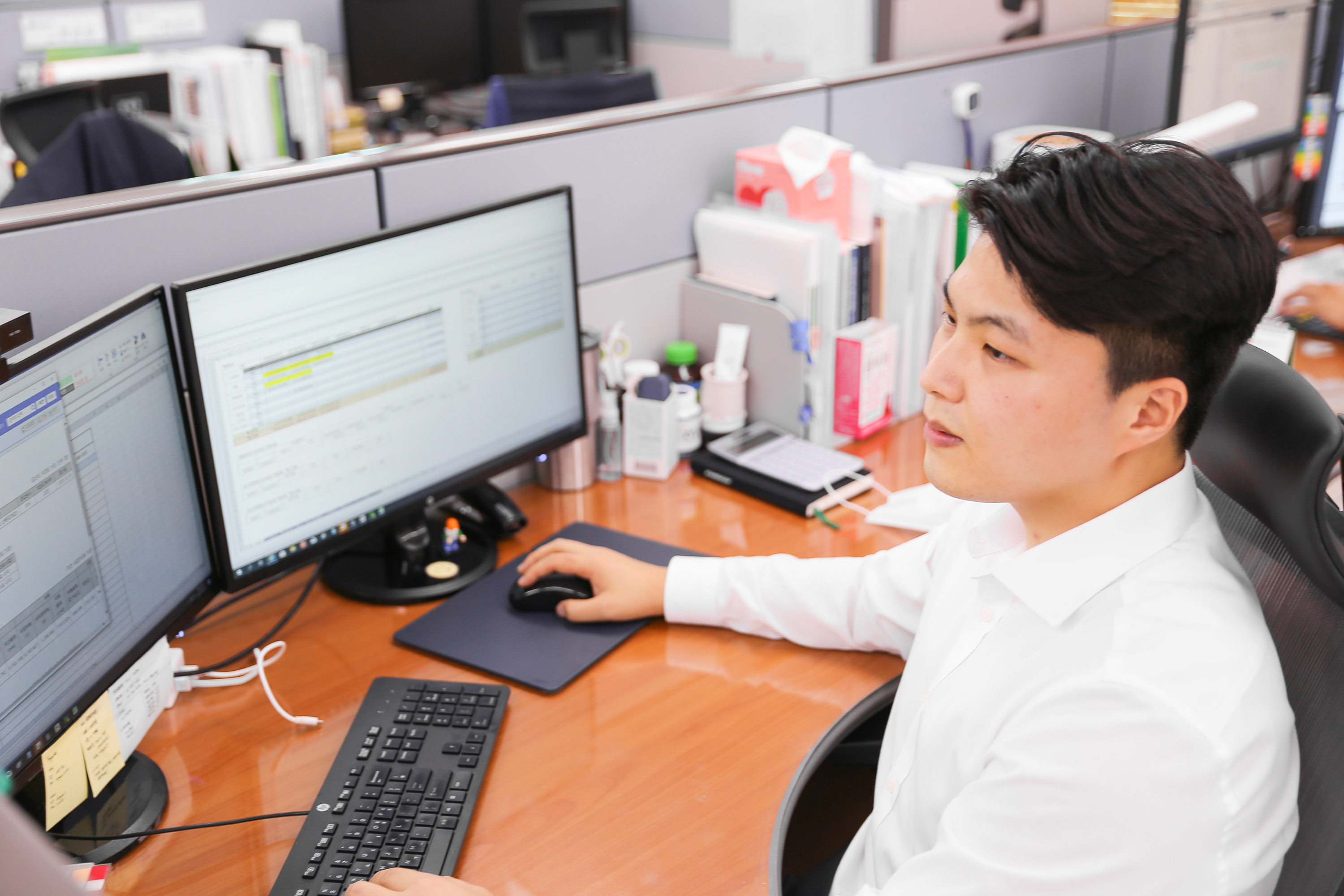아침에 출근하면 전일의 금융시장 동향과 주가 보고자료를 작성하는 것으로 시작해요. 경영진과 기획관리팀에 자료를 송부하고 나면 제 본 업무가 시작이 됩니다. 주 업무인 공시는 보고의 기한이 명확히 있는 업무이다 보니, 마감 기한을 토대로 2~3주 전부터는 자료 작성에 심혈을 기울이게 됩니다. 공시 시즌이 아닐 때는 회사의 실적 보고를 위한 회의자료 작성과 타사의 동향 등 기획업무를 맡아 진행하고 있습니다.