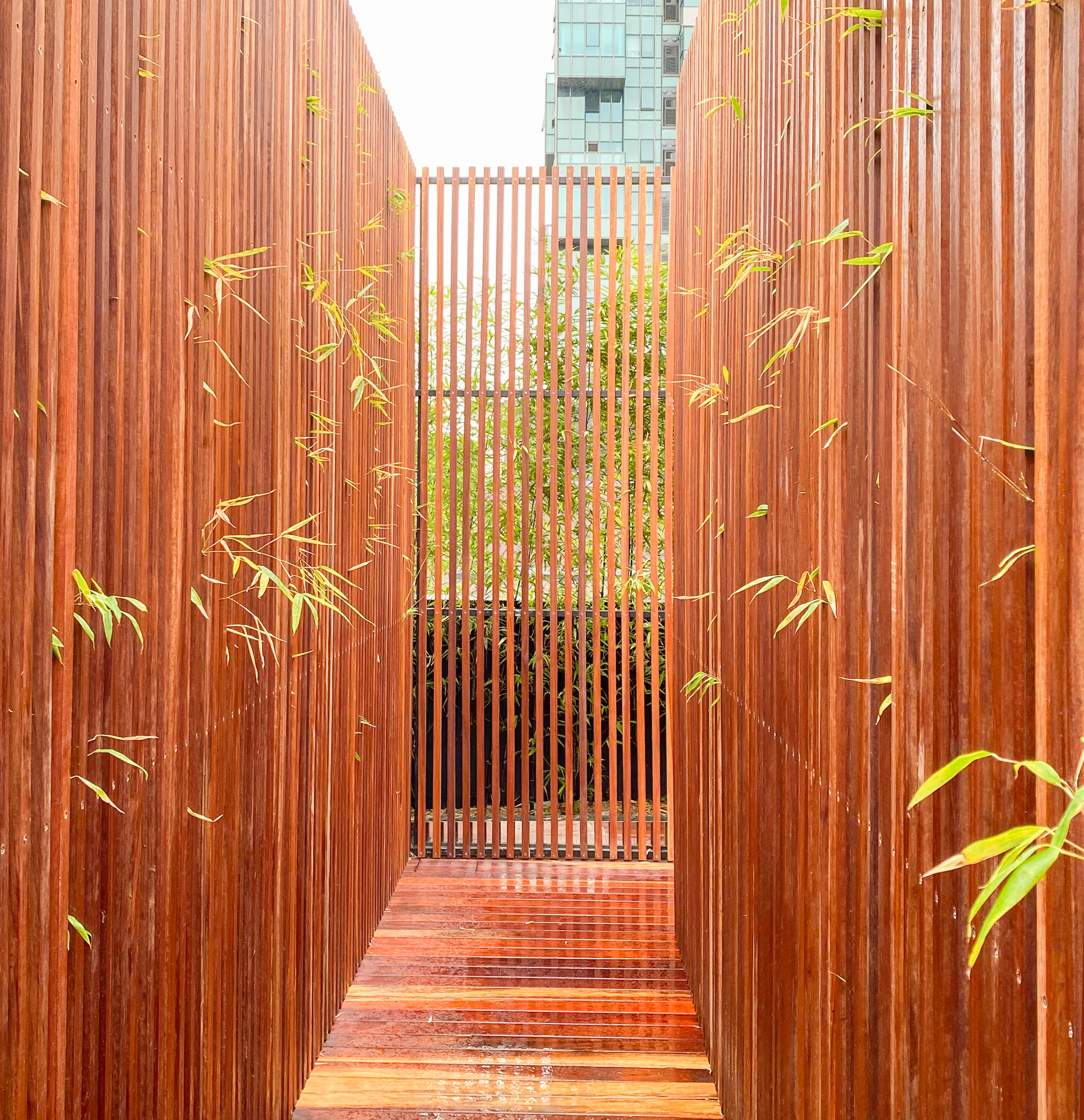 길고 좁게 만들어진 나무들로 만들어진 길. 균일하게 정렬된 나무들의 틈 사이로 삐져나온 초록 잎들이 대나무 숲 한가운데에 있는 듯한 느낌을 줍니다. 방문 당일은 오전부터 비가 와서 나무 바닥이 젖어 있었어요. 평소엔 젖어있지 않겠지만, 맨발로 물을 자박이며 올라왔던 전시와 오히려 잘 어울린다고 느꼈던 것 같아요. 끝과 끝에 서서 사진을 남기면 마치 도심을 벗어난 듯한 사진을 남길 수 있답니다.