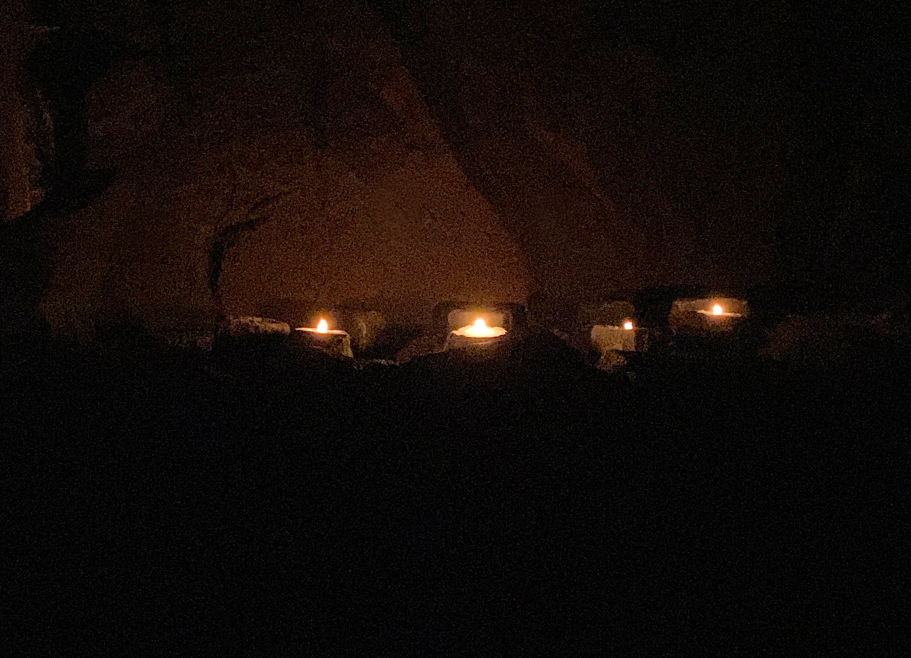처음엔 시각과 청각을 완전히 차단하고 손끝과 발끝에 의존해 걸어가는 공간으로 시작됩니다. 어둠이 깊게 내려앉은 공간에서 발에 느껴지는 땅과 바닥, 벽을 짚는 손에서 느껴지는 감각에 오롯이 집중해 보세요.