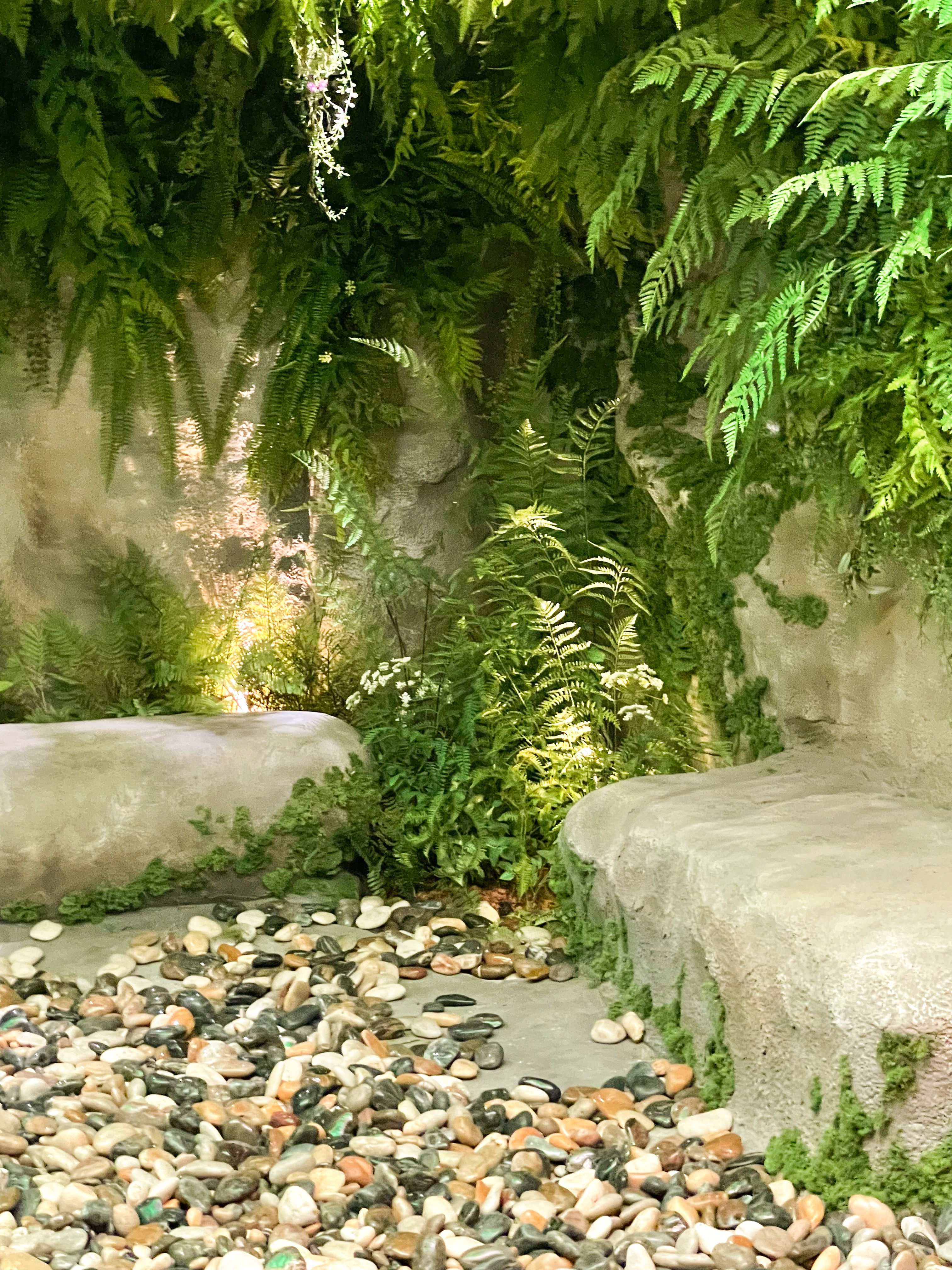 섬세이가 만들어낸 도심 속 자연이 그대로 재현돼 있습니다. 발아래로는 자연 그대로의 자갈과 나무줄기들이 느껴져 복잡한 도심에서 갑자기 자연 한복판으로 끌려 들어온 기분이에요. 특히 이 공간은 바닥에 자갈돌이 많이 깔려 있어 자연스럽게 발바닥 지압이 가능했어요.