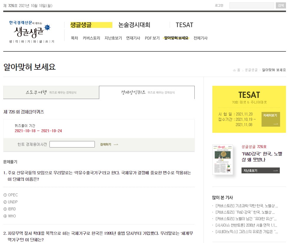 ‘경제상식퀴즈’에서는 경제와 경영 분야 시사상식을 퀴즈 형식으로 제공해 문제를 풀며 자연스럽게 시사상식을 익혀 갈 수 있습니다. 아직 시사상식이 다소 어렵게 느껴지거나 처음 준비하는 단계라면 생글생글을 통해 하나씩 차근차근 배워가는 것은 어떨까요?