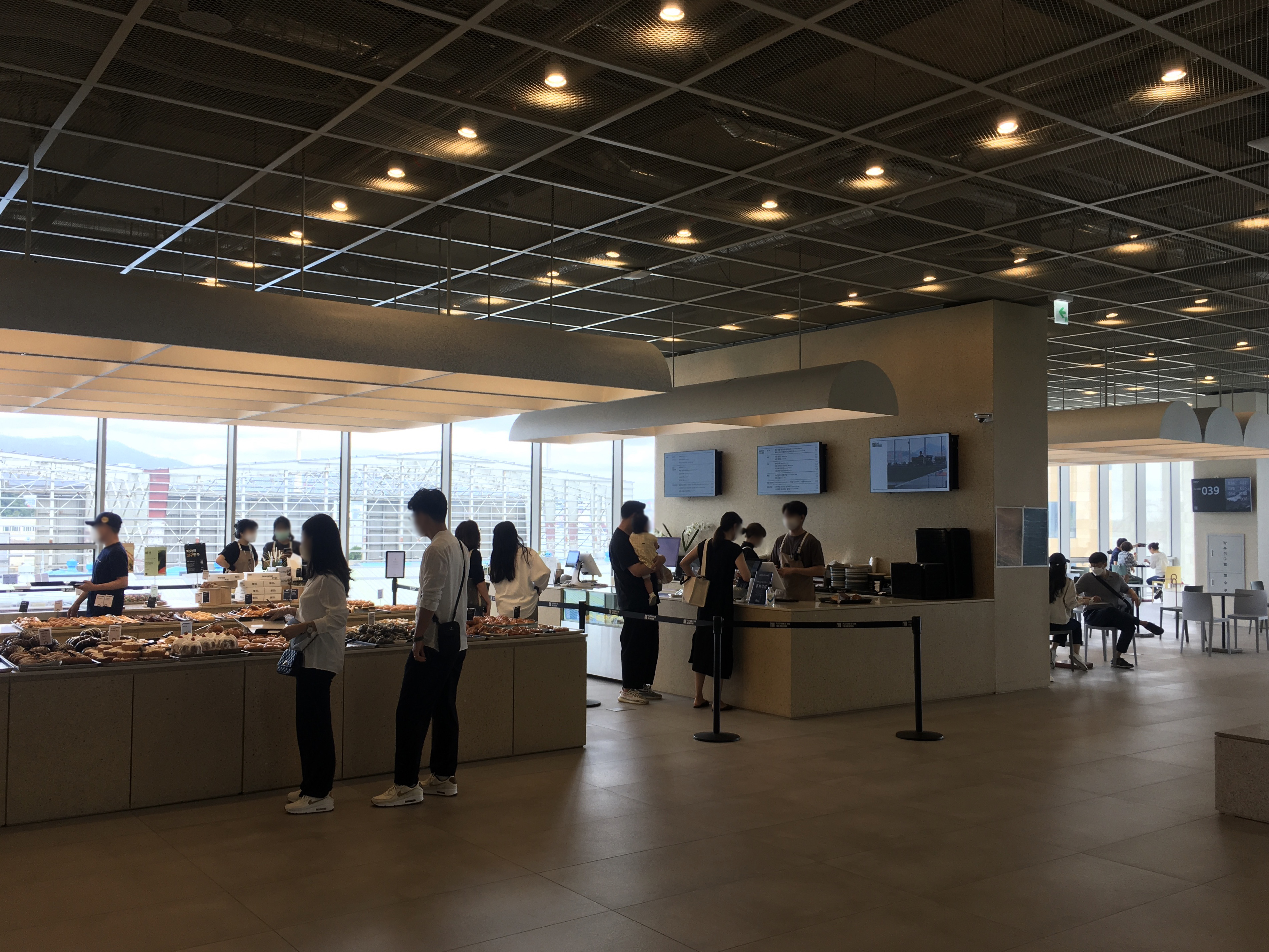 처음 방문하는 대부분 사람들의 행선지는 4층 카페&베이커리예요. 첫 인상은 시원한 개방감입니다. 에스컬레이터나 엘리베이터를 타고 카페에 도착하면 확 트인 공간에 탄성이 절로 나와요. 부산항대교가 놓인 부산항과 오륙도 배경의 오션뷰가 장관이죠.