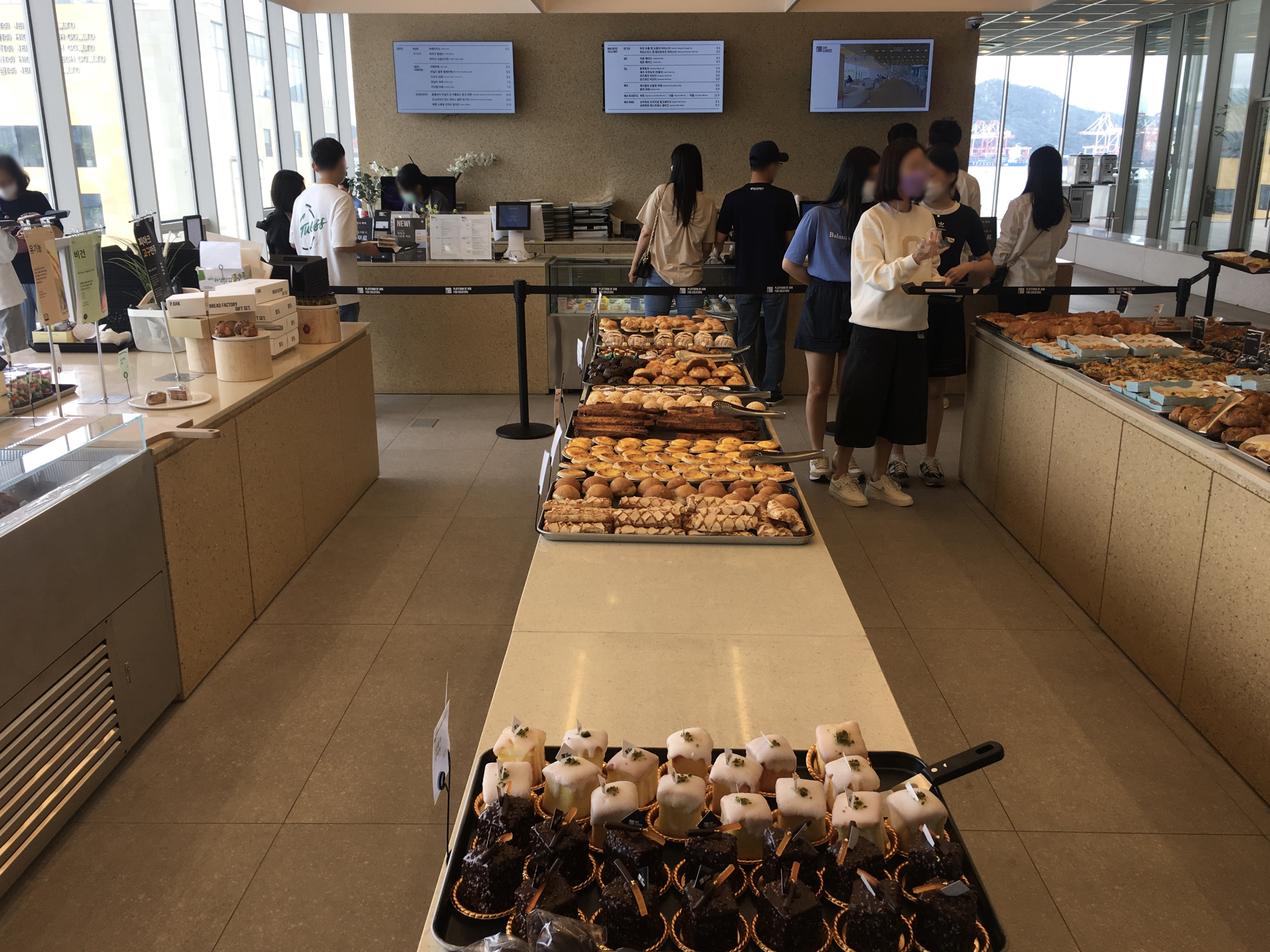 처음 방문하는 대부분 사람들의 행선지는 4층 카페&베이커리예요. 첫 인상은 시원한 개방감입니다. 에스컬레이터나 엘리베이터를 타고 카페에 도착하면 확 트인 공간에 탄성이 절로 나와요. 부산항대교가 놓인 부산항과 오륙도 배경의 오션뷰가 장관이죠.