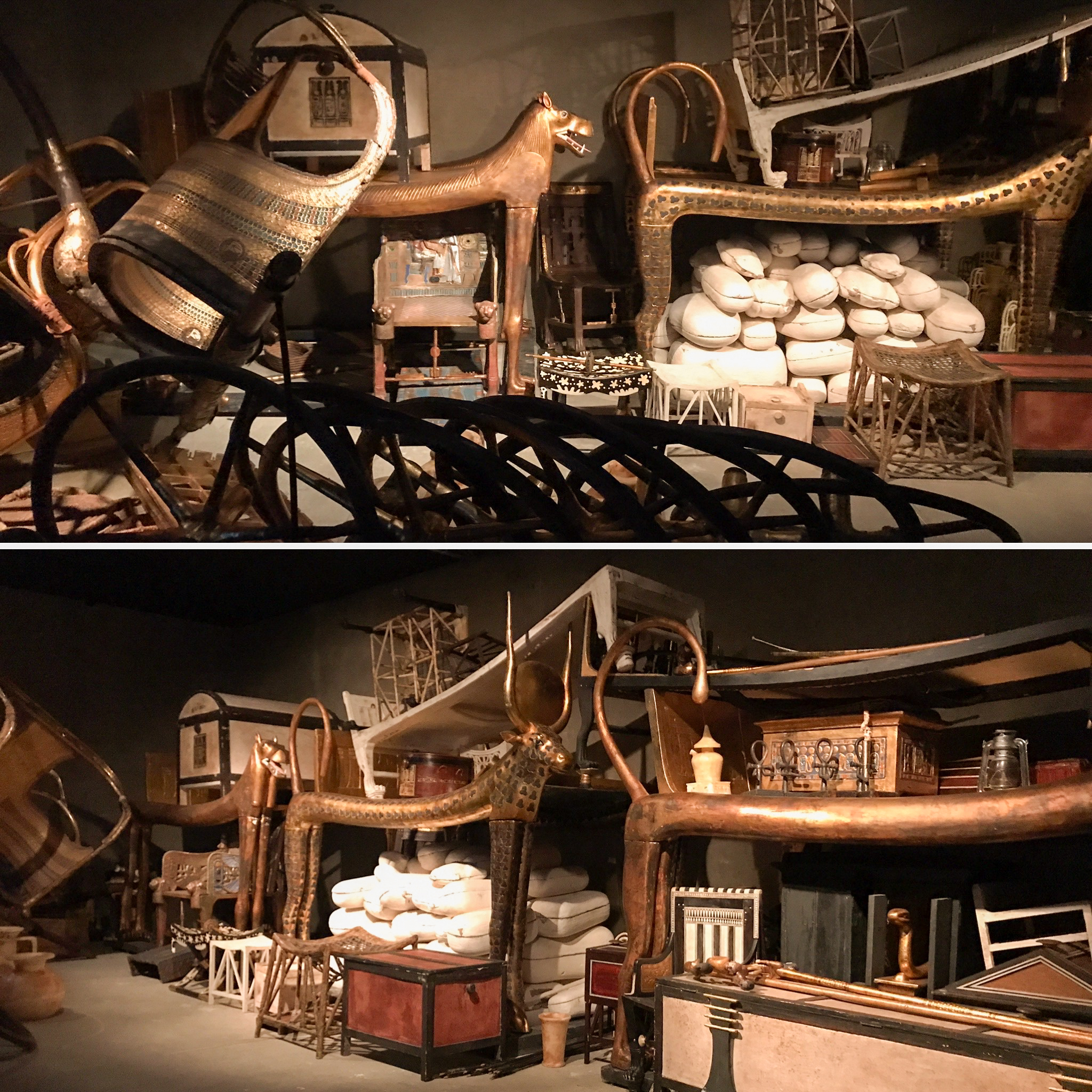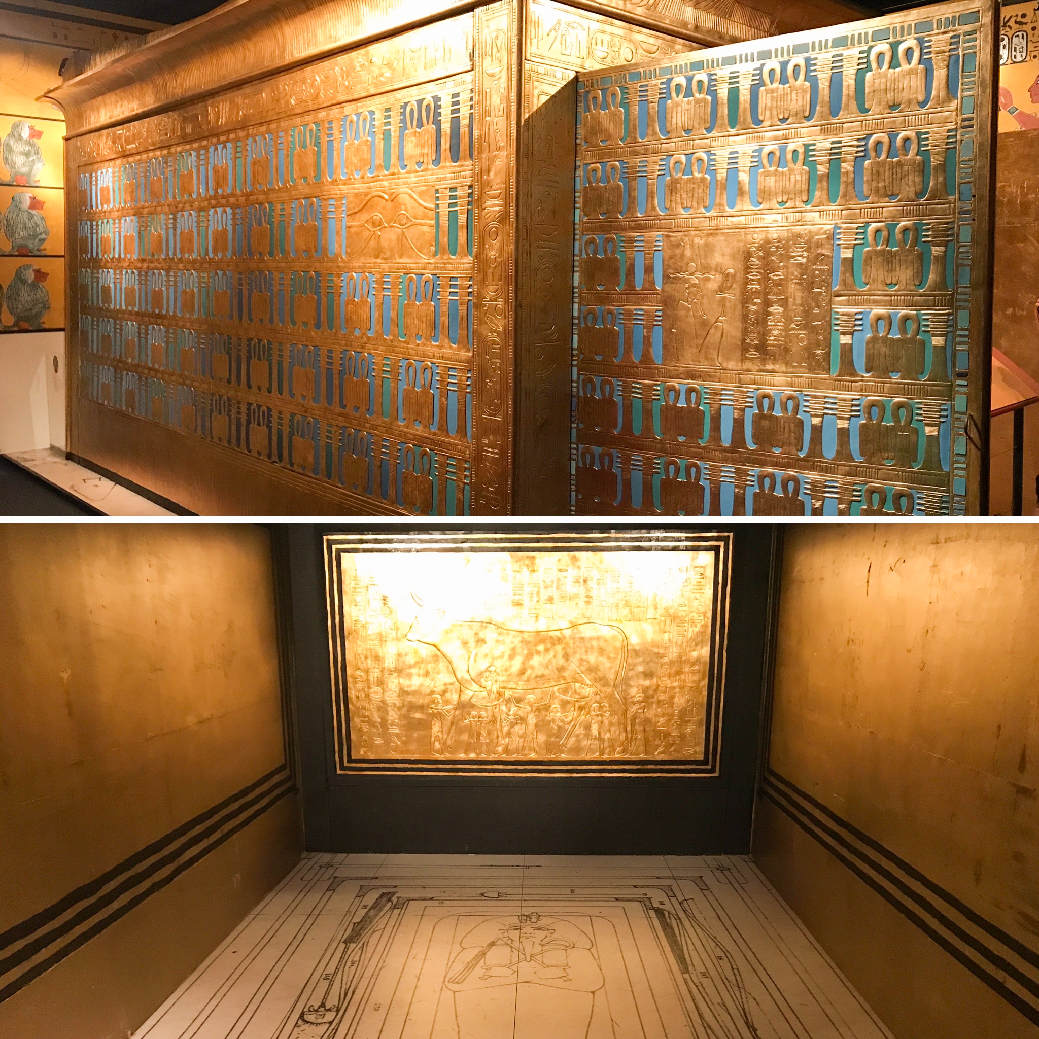 <투탕카멘: 파라오의 비밀> 전시의 특징은 발굴 당시 투탕카멘 무덤을 그대로 재현해 놓았다는 점이에요. 전시된 유물은 모두 복제품이지만 단순히 따라 한 것이 아니라 이집트 고고학자들의 철저한 고증을 거쳐 만들어졌어요.