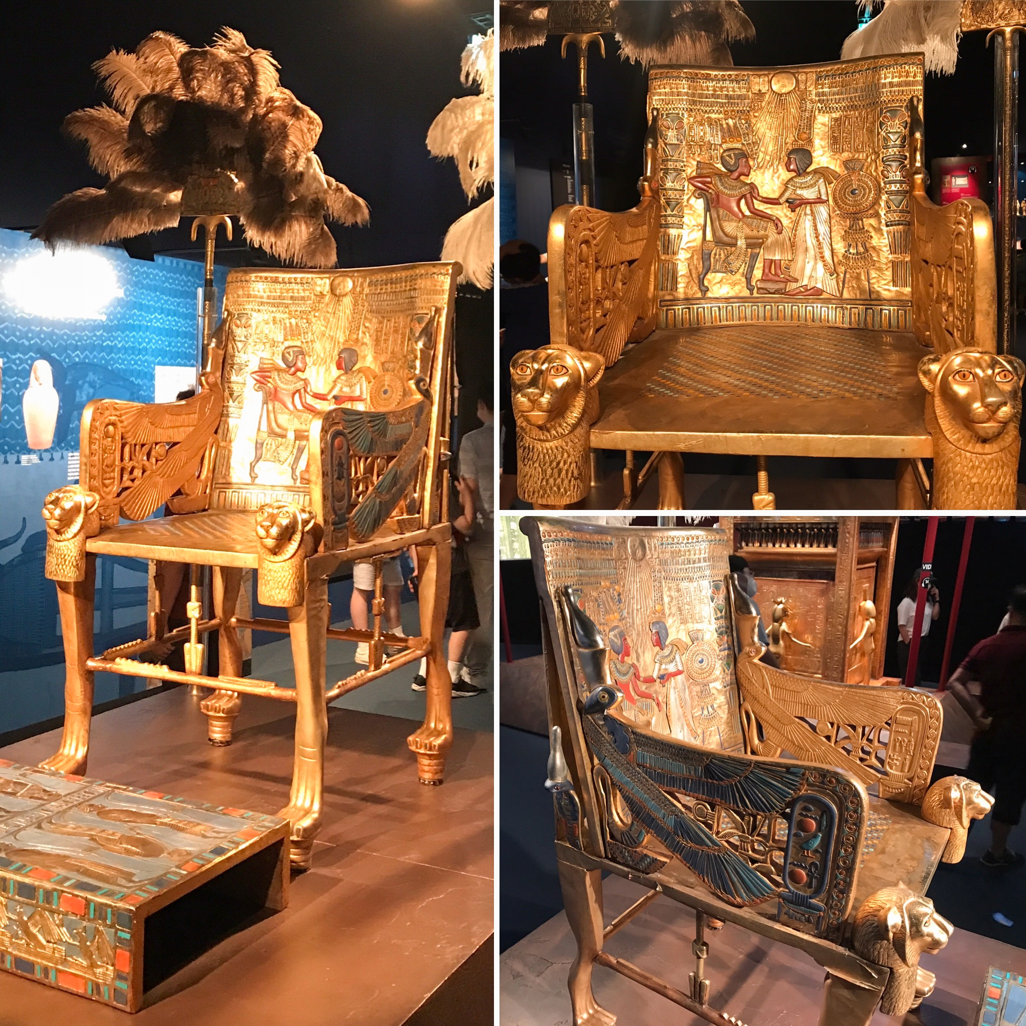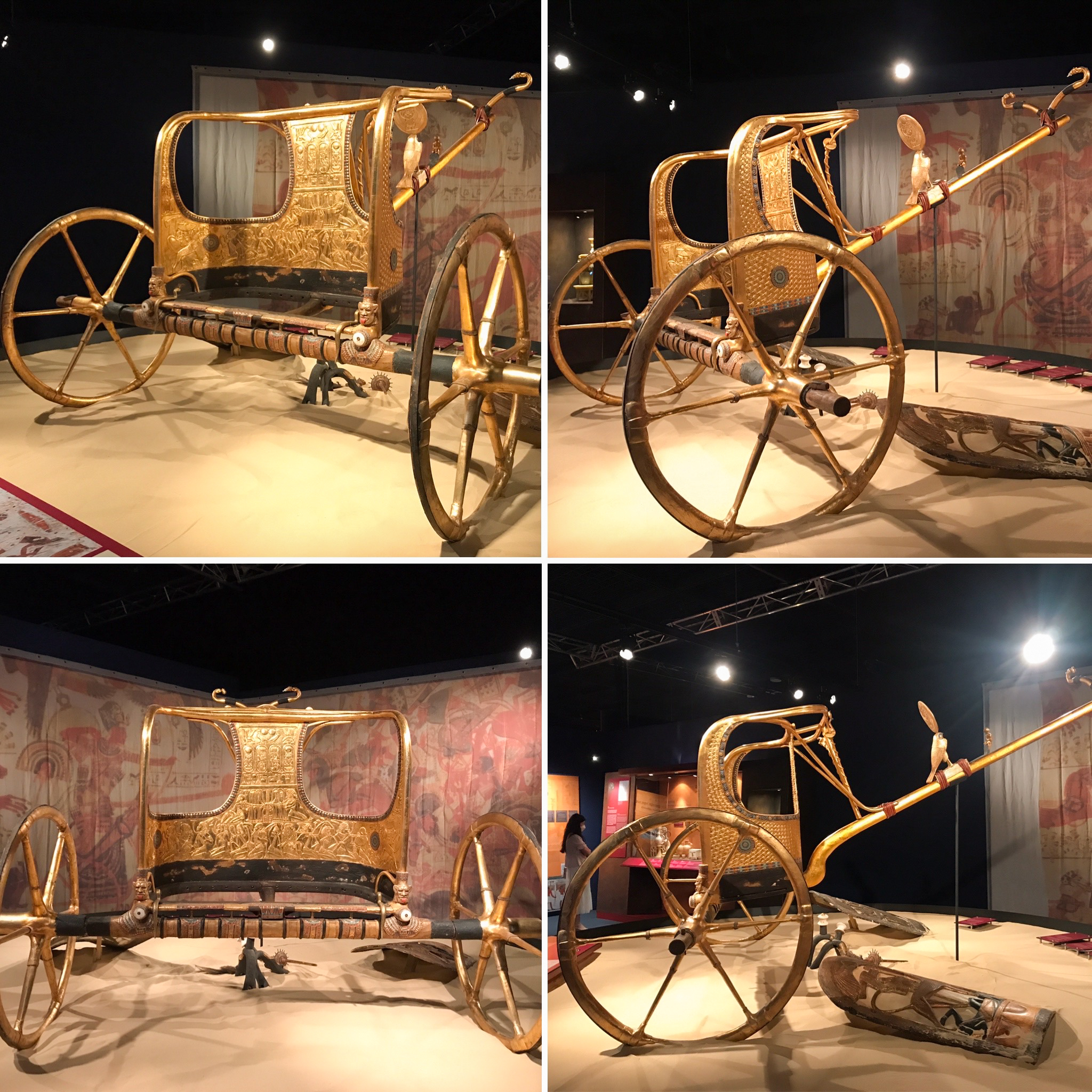 이 밖에서도 무덤에서 출토된 가구, 옷, 전차, 무기 등 살아생전 파라오가 쓰던 물건들이 전시되어 있는데요. 대형 황금 전차와 발 받침대가 있는 황금 왕좌, 황금 손가락·발가락 감싸게, 발길이 299㎜의 황금 샌들, 도금된 온갖 신상들이 시선을 사로잡아요.