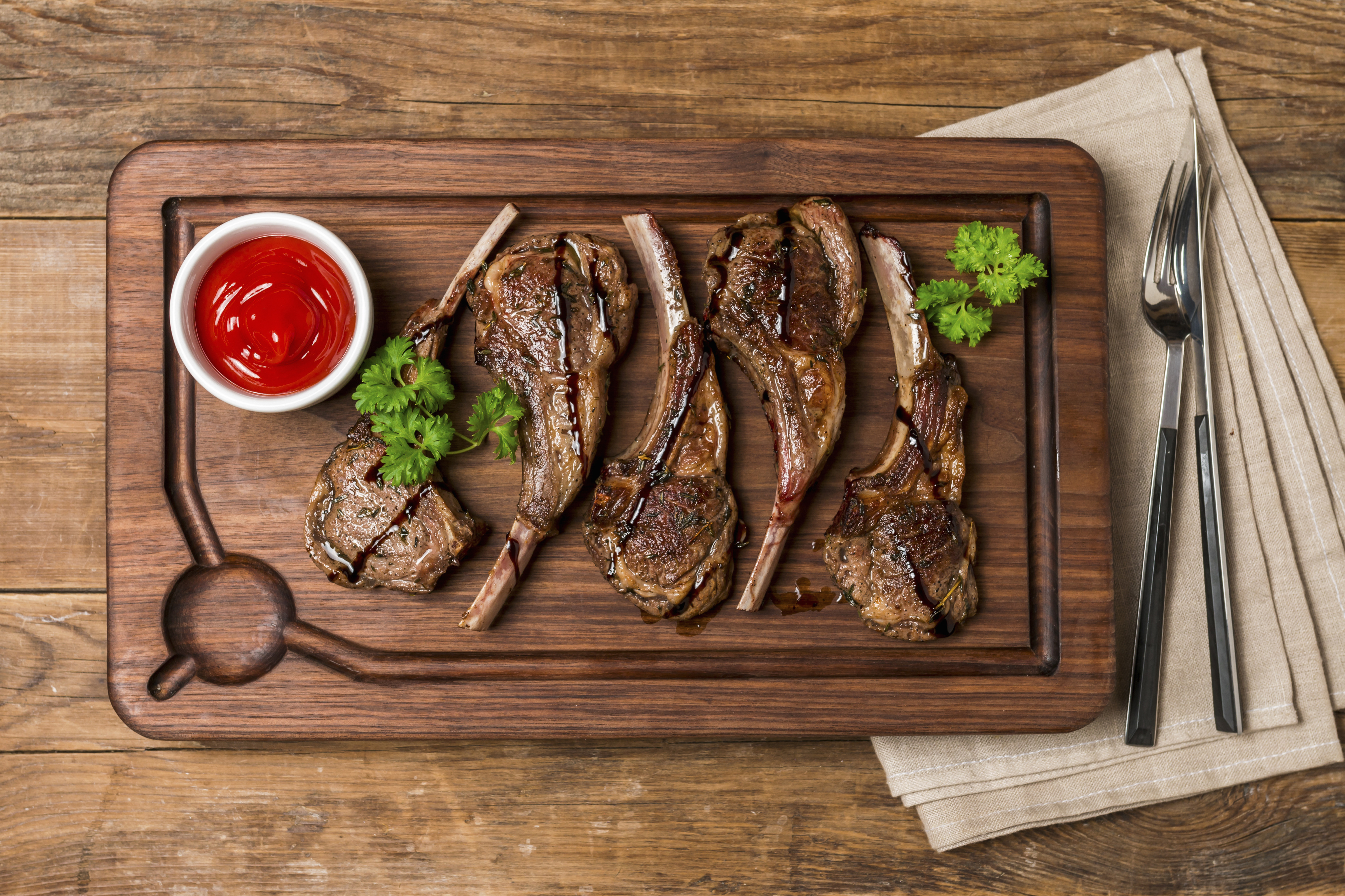 요즘 한창 유행인 양갈비 중 프렌치 랙을 칼집을 낸 다음 구해 소금, 후추, 올리브유로 간을 하여 미리 오븐에 구워 익혀요. 양갈비의 끄트머리에 쿠킹포일을 감싸 손잡이를 만들어요. 먹기 전에 양갈비 전체를 쿠킹포일로 감싸 오븐에 넣어 살짝 데워 냅니다. 머스터드와 함께 차려냅니다. 다른 육류도 좋지만, 연말의 양갈비는 특별한 분위기를 선사한답니다. 냉장 유통하는 양갈비는 특유의 향도 진하지 않아 누구나 먹기 좋아요.