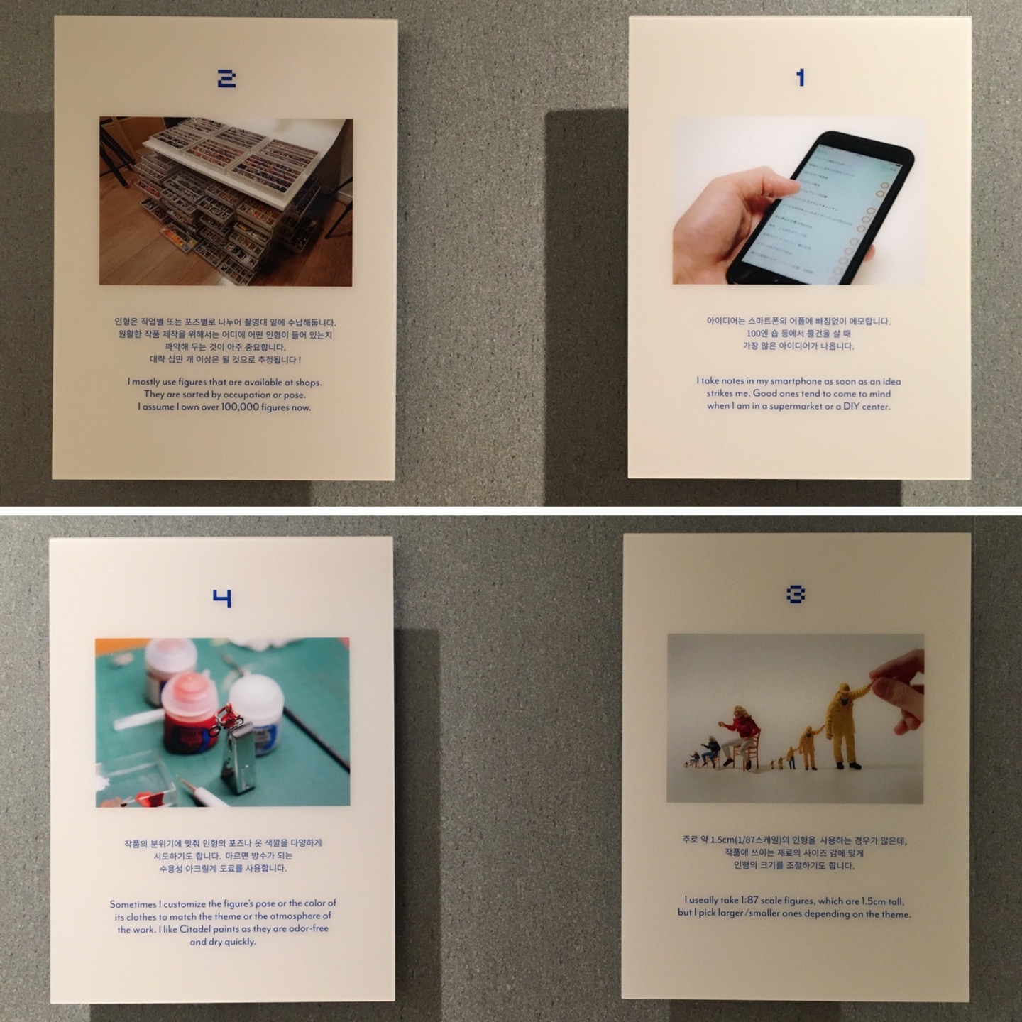 전시장에 들어서면 타나카 타츠야가 미니어처 작품을 만드는 과정이 소개되어 있어요. 그는 떠오르는 아이디어는 항상 스마트폰 어플에 메모하는 습관이 있는데, 일본의 ‘100엔 숍’에서 쇼핑을 할 때 가장 많은 아이디어가 떠오른다고 해요. 평범한 일상 속 물건을 타나카 타츠야는 다른 시선으로 바라보기 때문에 남다른 아이디어가 생기는 것이겠죠.