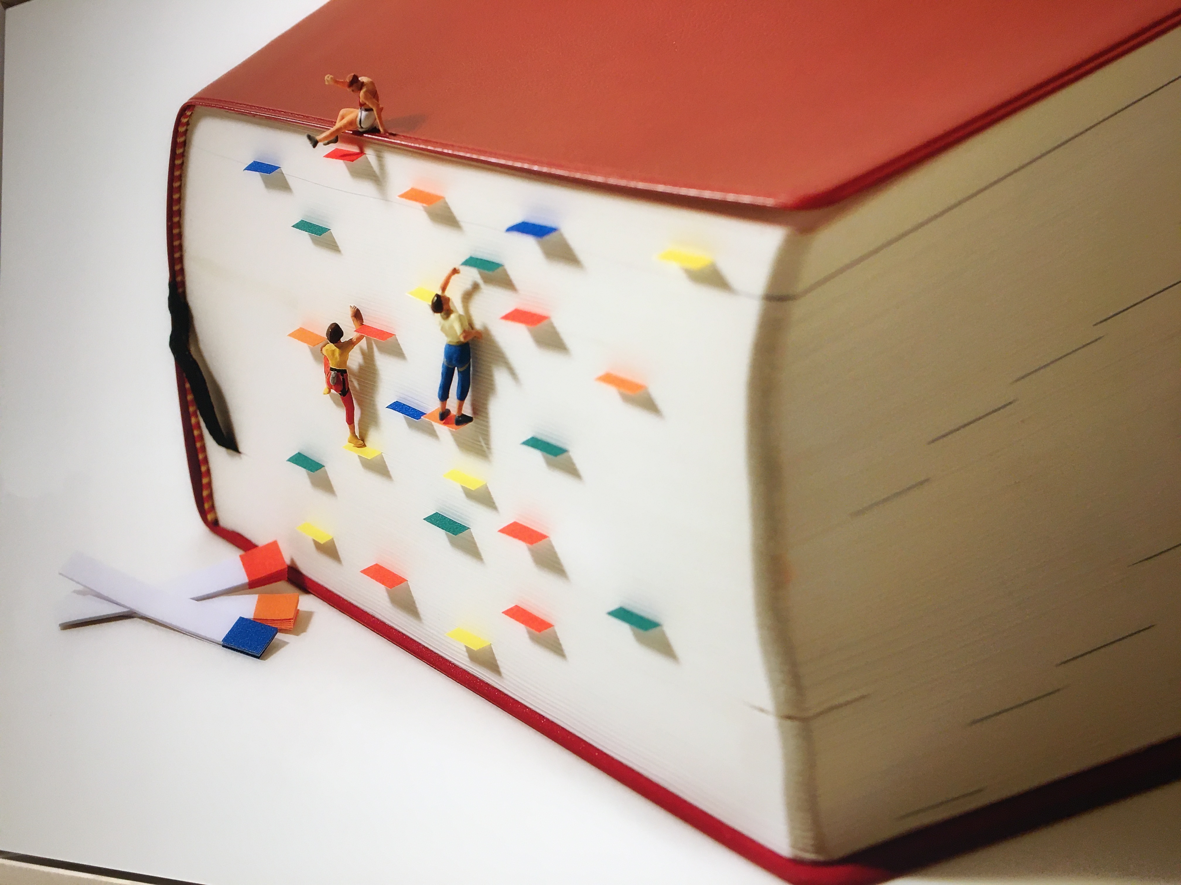 스프링이 달린 수첩이 길거리 빌딩이나 수영장이 되고, 두꺼운 사전에 붙인 색인 스티커는 스포츠 클라이밍장으로 변신해요. 누군가에게는 일하고 공부하던 사물이지만, 타나카 타츠야에게는 미소 짓게 만드는 작품의 소재가 되는 것이죠.