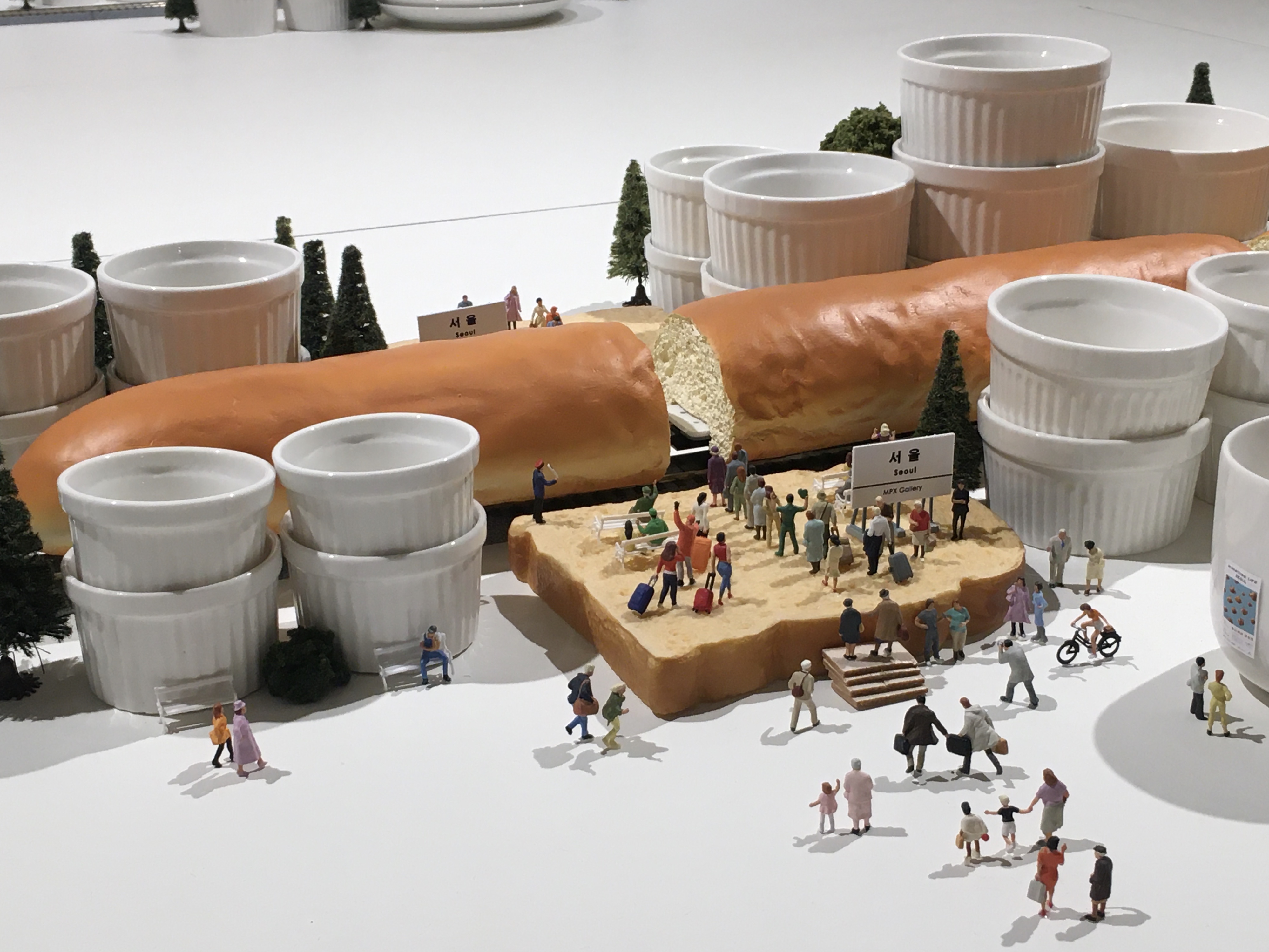 이번 전시에서 유일하게 움직이는 ‘신빵센’ 작품은 일본의 고속열차인 ‘신칸센’을 바게트로 만들었어요. 역은 접시와 그릇, 소스 그릇 등으로 만들었죠.