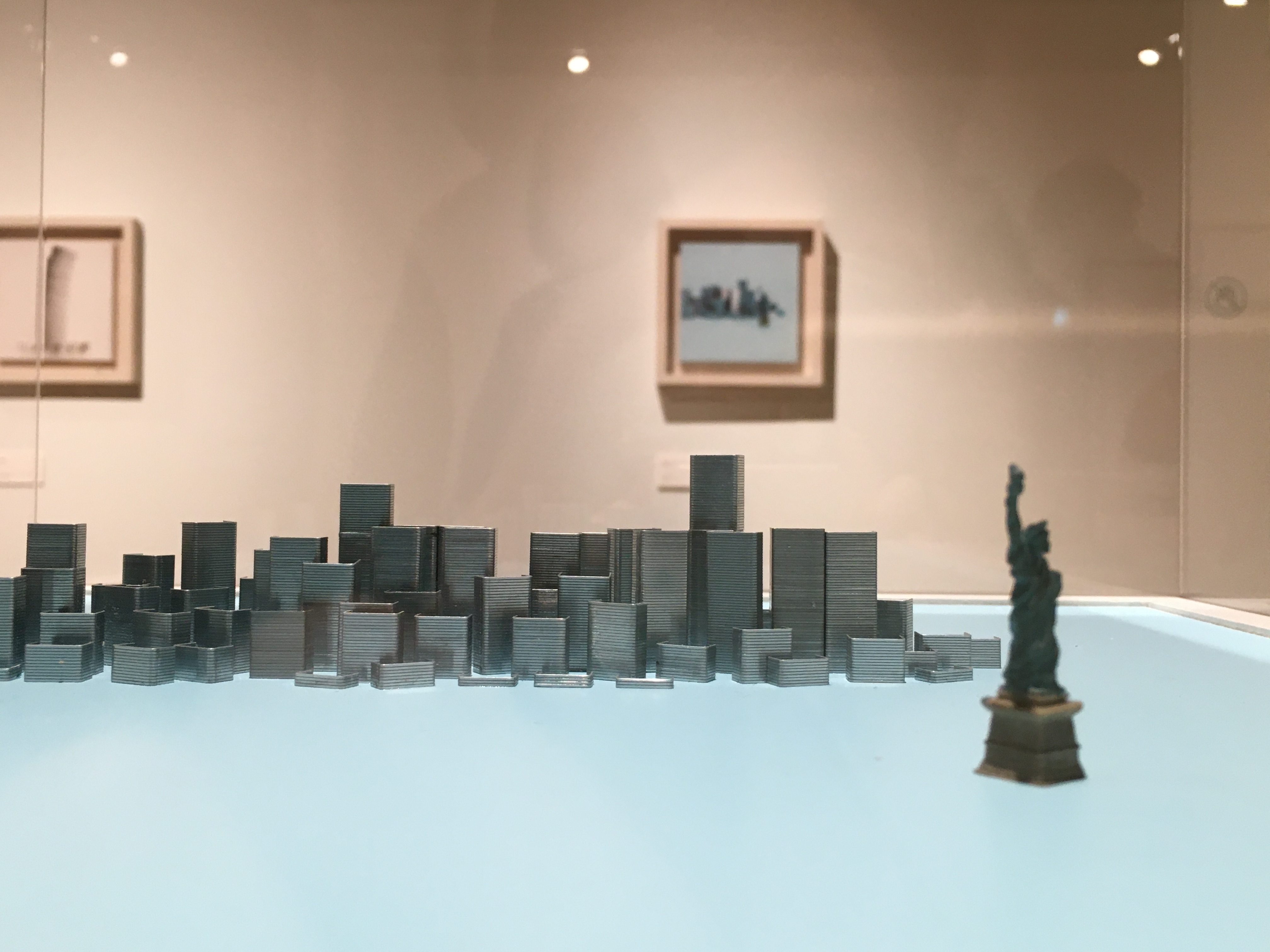 사무실에서 흔히 사용하는 스테이플러는 자유의 여신상이 우뚝 서 있는 뉴욕 맨하튼의 빌딩 숲과 자료실 책장이 되기도 해요. 스테이플러의 심은 종이 모퉁이에 박히는 작은 소모품이지만, 작품에서는 심 박힌 자료를 수없이 보관할 수 있는 도서관 자료실이나 거대한 도시의 풍경이 됩니다.