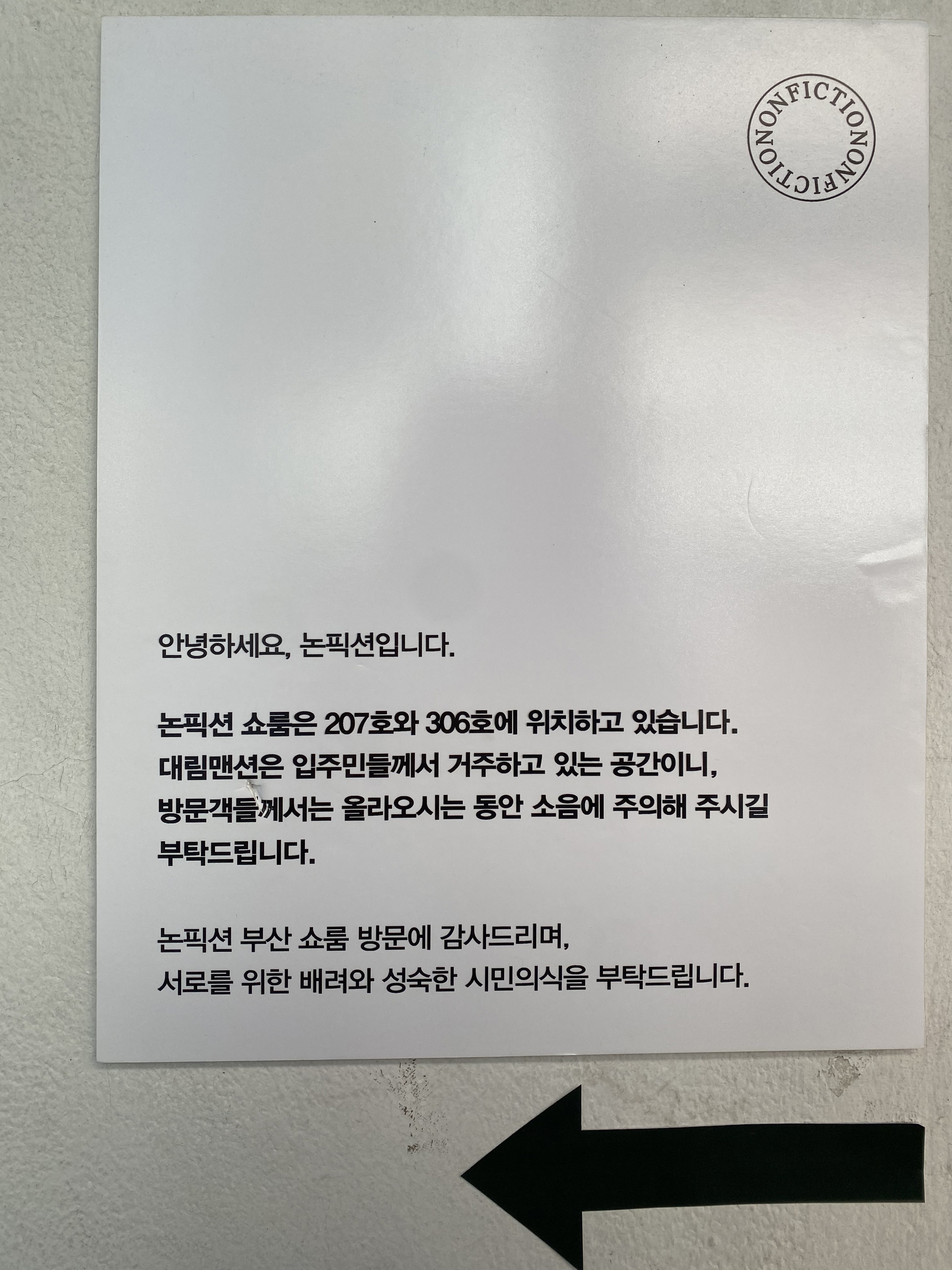 대림맨숀에는 논픽션 쇼룸 말고도 훌리건타르트와 가죽 브랜드 이스트허니, 패션 브랜드 모던에이블 그리고 맨션501,리미리미까지 다양한 브랜드들의 쇼룸이 입점해 있어요. 하지만 방문한 날에는 논픽션 쇼룸만 오픈해 있어서 논픽션 쇼룸만 보고 왔는데, 부산 해운대에 가신다면 꼭 한번 들러서 아기자기한 브랜드들의 감성을 구경해보시는 것을 추천해 드려요. 화려한 호텔과 외제차 전시장 사이에 조용하게 있던 오래된 맨션 속에 이런 귀여운 브랜드 쇼룸들이 숨어서 한껏 멋을 뽐내고 있답니다 :)