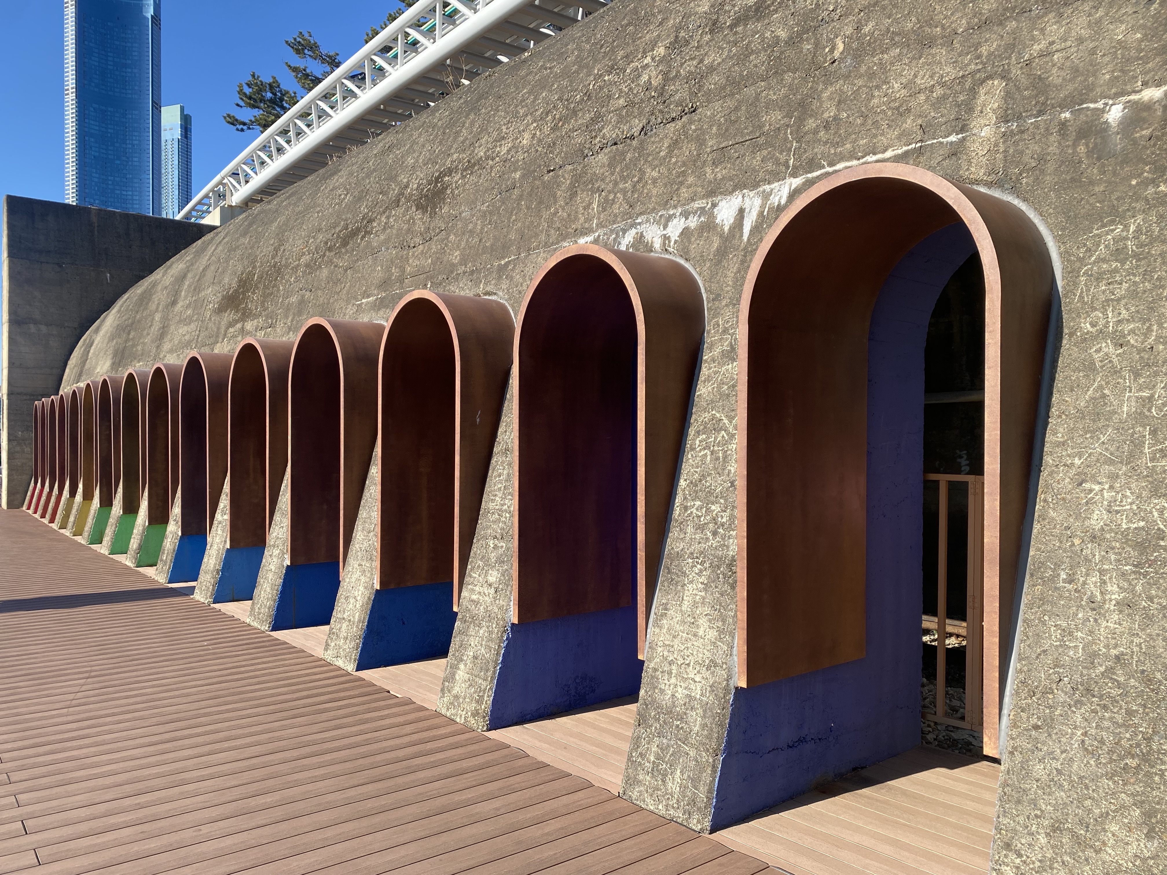 청사포->미포행 해변열차를 타고 가는 도중에 달맞이 터널에서 하차했어요. 미포->달맞이 터널은 540m로 해변열차의 코스 중 가장 짧은 코스인데요. 이 달맞이터널은 외벽이 알록달록하게 칠해져 있어서 터널을 뒤로 하고 사진을 찍으면 귀엽게 잘 나오더라구요. 특히 해변열차 바로 위에 스카이캡슐 모노레일이 있기 때문에 타이밍을 잘 맞추면 달맞이 터널 앞에 있을 때 배경으로 지나가고 있는 스카이캡슐이 찍힐 수도 있어요.