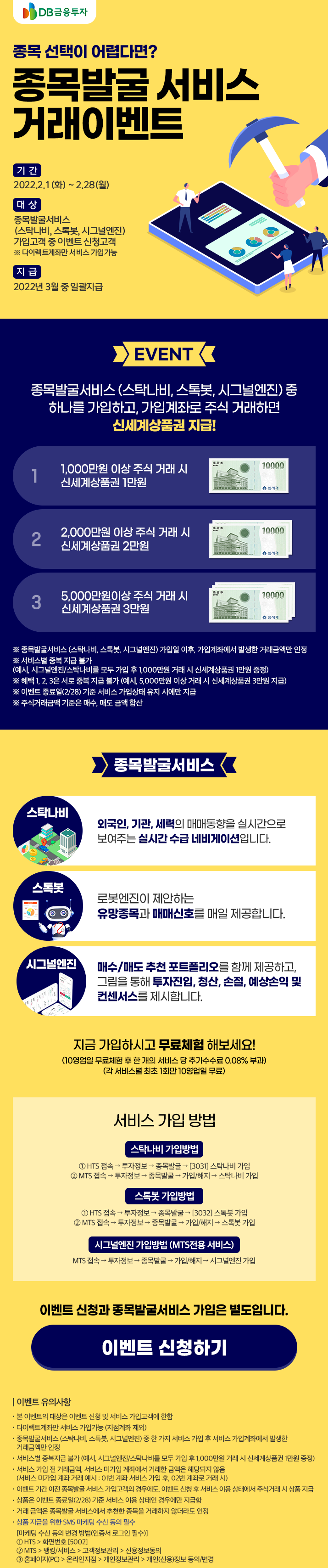 | DB금융투자,3월 새출발 응원 주식거래 이벤트 (0) | 2022.03.02 |
