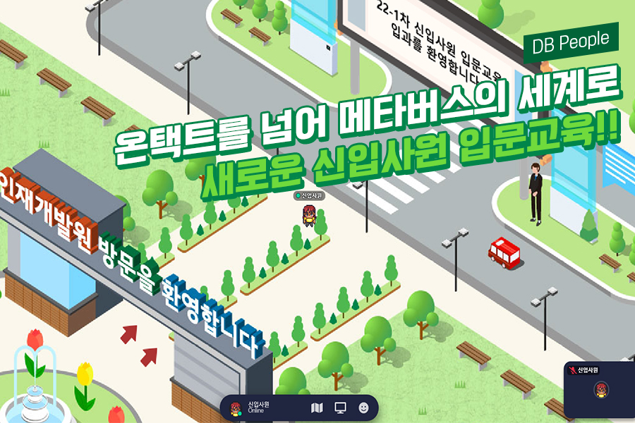 코로나19가 확산된 2020년부터 DB그룹은 대부분의 사내 교육을 온택트로 전환했다. DB인재개발원은 온택트 교육 운영 노하우를 바탕으로 직원들의 몰입도를 높이고, 직원간 교류를 강화하고자 메타버스 플랫폼 도입에도 적극적이다. 기존 집체교육을 대체했던 화상교육에 직원들 사이의 소통과 관계형성 기회를 늘리겠다는 판단에서다. 2022년 DB그룹 신입사원 입문교육은 온택트 교육에 메타버스를 활용한 것이 특징이다. DB인재개발원을 찾아 가상과 현실을 오가며 꿈과 비전을 나눈 신입사원 입문교육 현장의 열기를 살펴봤다.