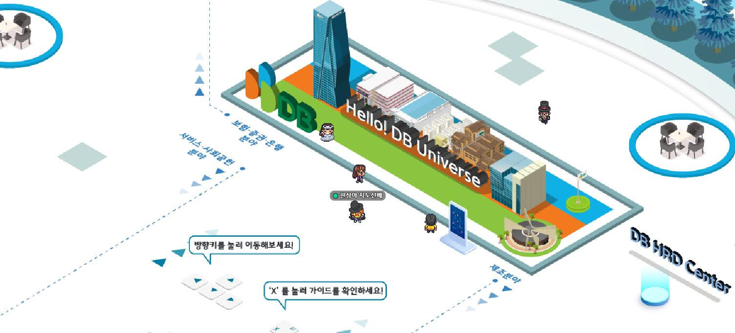 DB Universe에 구현한 DB그룹의 전 사업분야 공간에는 교육생들이 접속해 자율적으로 각 관계사에 대해 세부적으로 학습하고, 상호 교류할 수 있도록 프로그램을 운영했다.