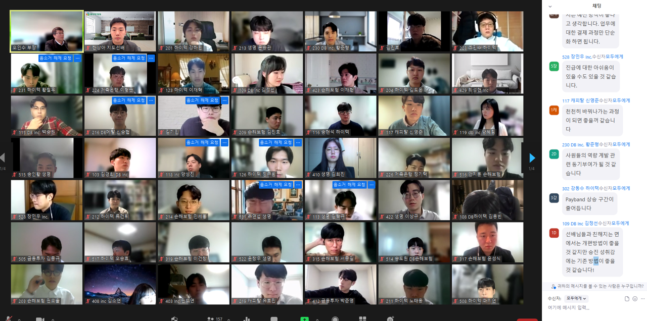 한편 교육 담당자 입장에서는 신입사원들이 온택트의 한계를 뛰어넘어 소통하고 참여하며 교육에 빠져든 모습을 볼 때 가장 뿌듯할 것이다. 한상아 과장은 수료식 시간에 3분 동안 팀별로 입문교육 활동 모습과 동기에게 전하고 싶은 메시지를 발표한 과제를 가장 기억에 남는 장면으로 꼽았다.