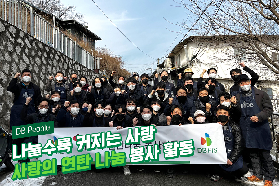 2022년 1월 22일 DB Inc.DB FIS ‘이웃사랑나눔위원회’는 서울시 정릉동에서 '사랑의 연탄나눔 봉사활동'을 펼쳤다. 추운 날씨에도 불구하고 임직원과 가족 40명과 열정 가득한 22년 DB Inc.DB FIS 신입사원들이 적극적으로 참여해 연탄 1,600장을 소외계층 8가구에 전달했다. 연탄 한 장은 한 번 불이 붙으면 10시간 이상 꾸준히 타기 때문에 최소 2장이면 작은 방 하나를 하루 종일 덥힐 수 있다. 연탄 봉사는 연탄 뿐만 아니라 마을 어르신들과의 유대감을 통한 정서적 지원도 동반하는 가치가 있다.