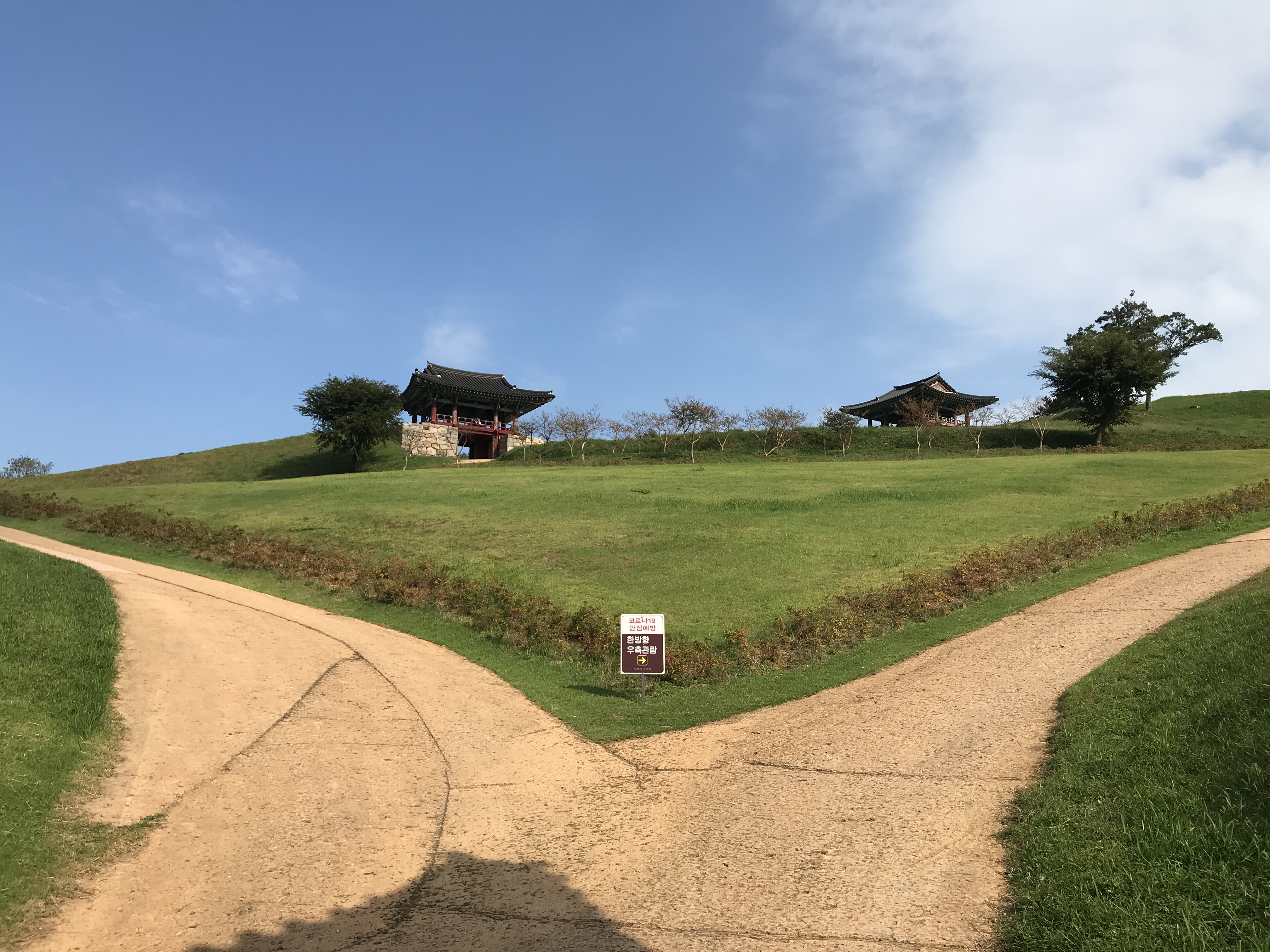 장도는 섬 전체가 계단식의 성의 형태로 흔적이 남아있어요. 흙을 다져 시루떡처럼 쌓은 성벽의 첫 관문인 외성문에 들어서면 가파른 잔디 언덕 위로 내성문과 고대(高臺)가 서 있고 동쪽과 서쪽으로 길이 갈라져 있어요.
