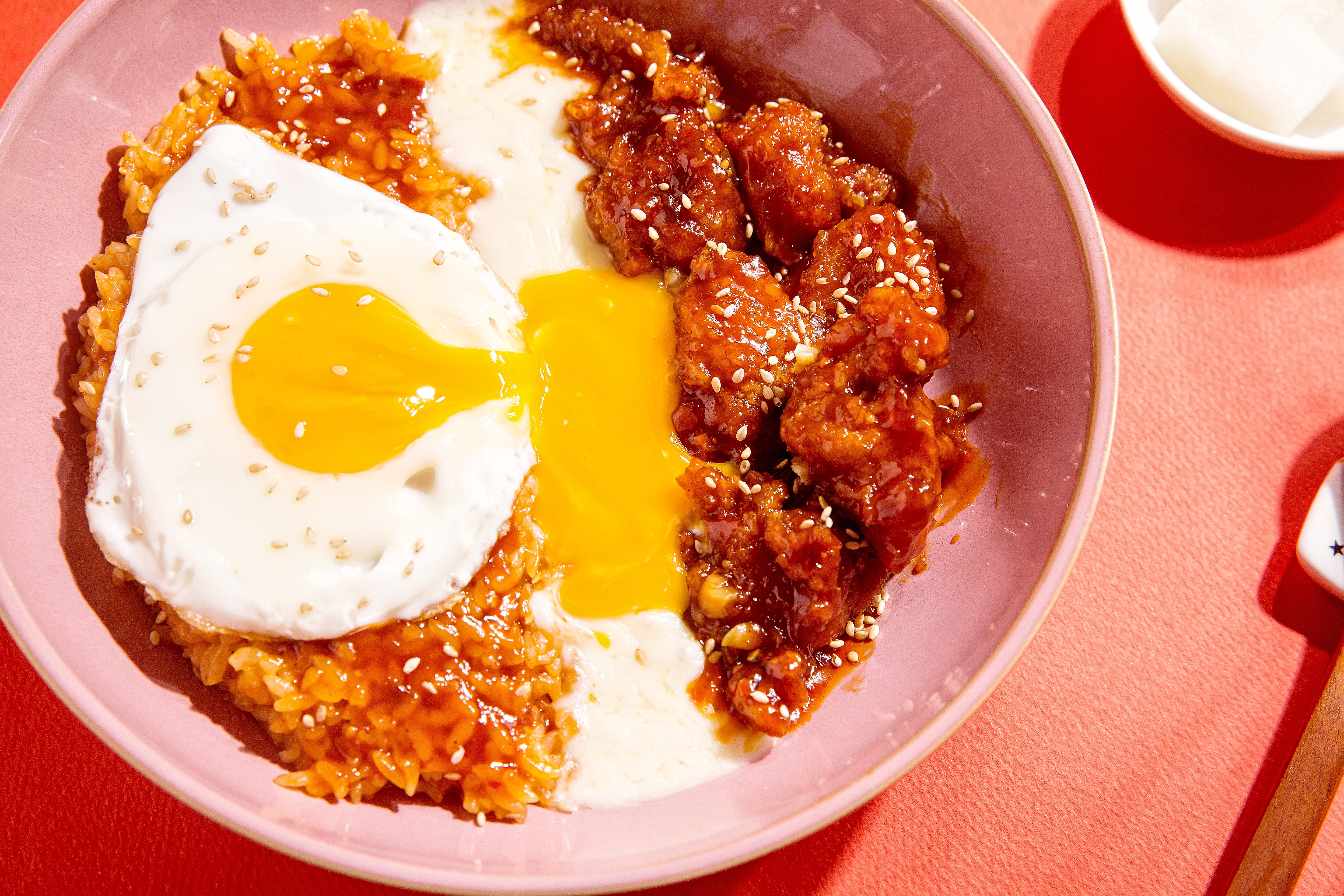 비벼 먹기 좋은 그릇에 따뜻한 밥, 볶은 달걀, 양파와 소스 국물, 치킨을 보기 좋게 얹은 다음 마요네즈를 골고루 뿌려주세요. 가능하다면 아주 곱게 채 썬 양파 조금, 쪽파나 부추를 송송 올려주거나 조미하지 않은 김도 바사삭 부숴 올리면 더 맛있어진답니다. 사실 이 요리는 마요네즈의 맛이 큰 역할을 해요. 다른 것들이 조금 어설프더라도 마요네즈만 있다면 충분히 맛 좋은 한 끼가 될 거예요.