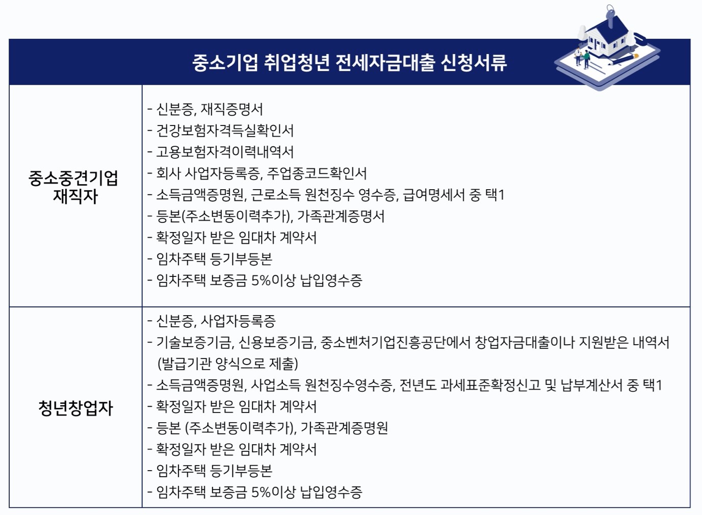 아래는 중소기업 취업 청년 전월세 보증금 대출 신청에 필요한 서류입니다.