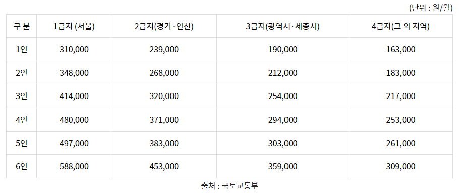 청년 주거급여 분리 지급 지원금액은 청년이 거주하는 지역과 가구원수별 기준임대료 상한 금액에 따라서 결정됩니다. 기준임대료 상한액이 있고 이를 넘어서는 임대료는 본인이 부담하게 되는데요. 지원금액은 매월 20일 청년 본인 명의의 계좌로 입금됩니다.