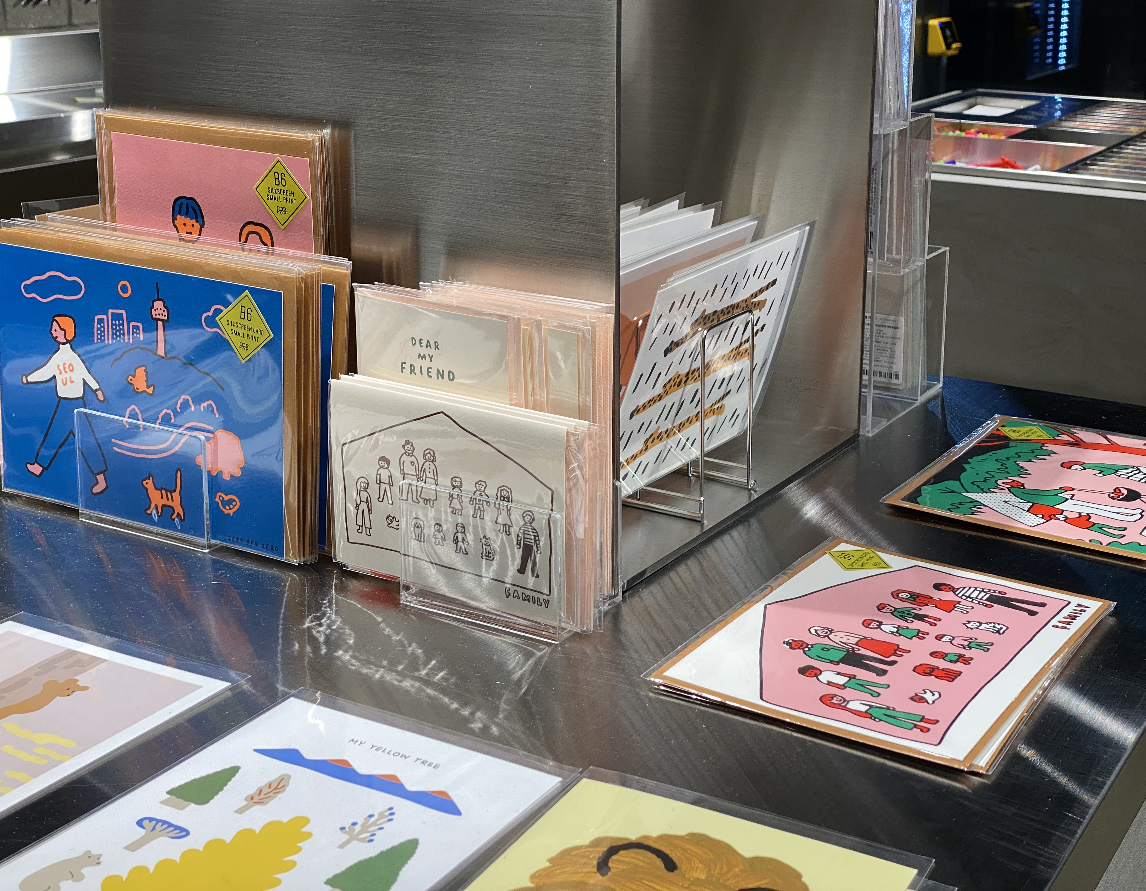 옛날에는 어느 동네를 가도 ‘문방구’가 있어서 볼펜도 사고, 학교 준비물도 사고, 생일이 다가오는 친구가 있다면 편지지도 샀던 기억이 있는데요. 요즘에는 문방구가 없어지고 팬시점, 아트 몰 같은 곳으로 대체되고 있죠. 이런 대형 팬시점과 아트 몰은 보통 사람들의 이동이 많은 번화가에 위치해 있다 보니 급히 편지지를 하나 사려면 살 곳이 없었던 적이 종종 있습니다. 이제 성수동에서 그럴 걱정은 끝! 모나미 스토어에 귀여운 일러스트가 그려진 기념일 카드와 엽서, 팝업카드가 많이 있어요. 저도 종종 주변 친구들 생일을 챙겨야 할 때 카드가 없어서 난감한 때가 있었기 때문에 이참에 모나미 스토어에서 카드도 몇 장 사서 구비해두었답니다:)