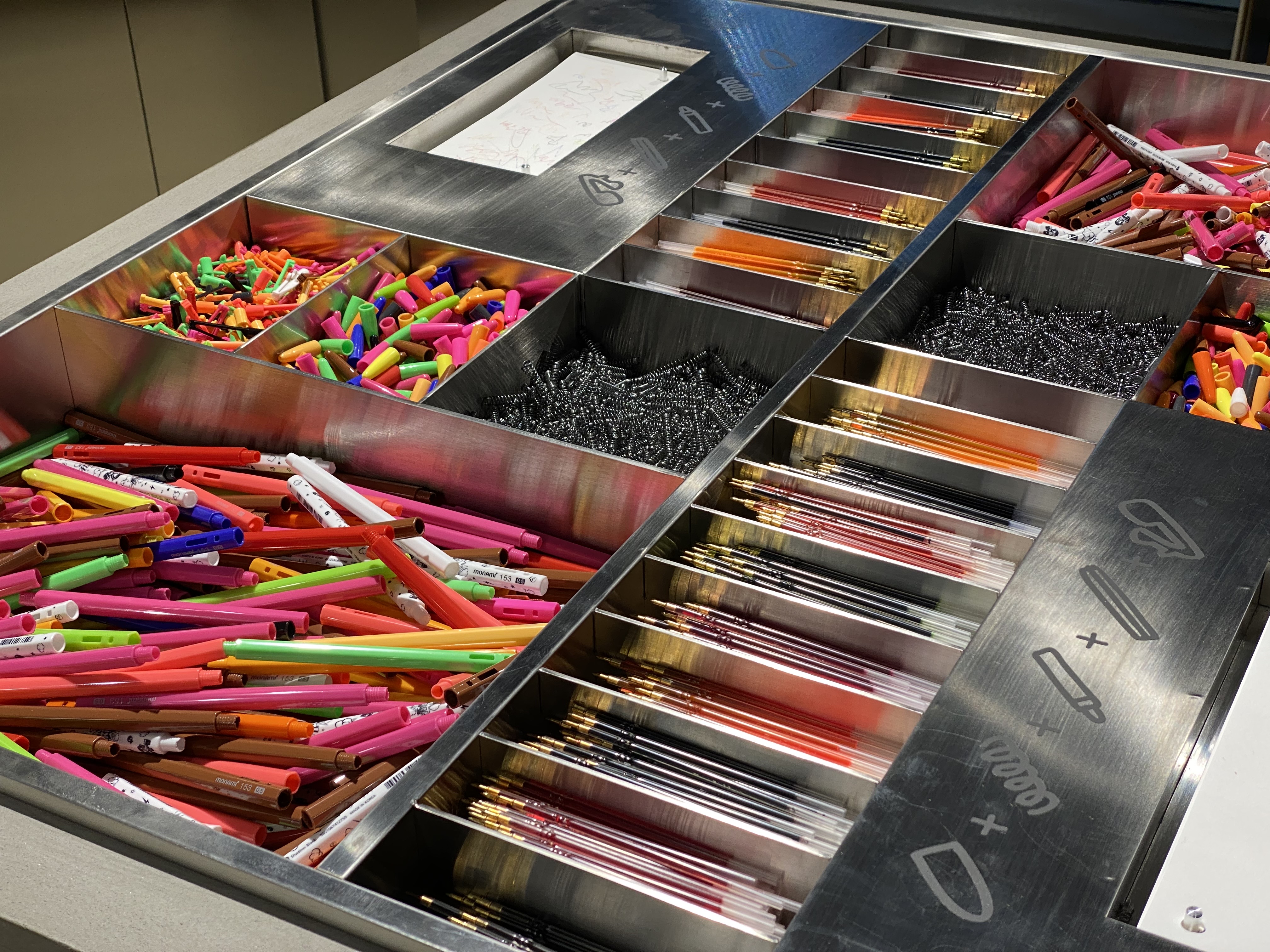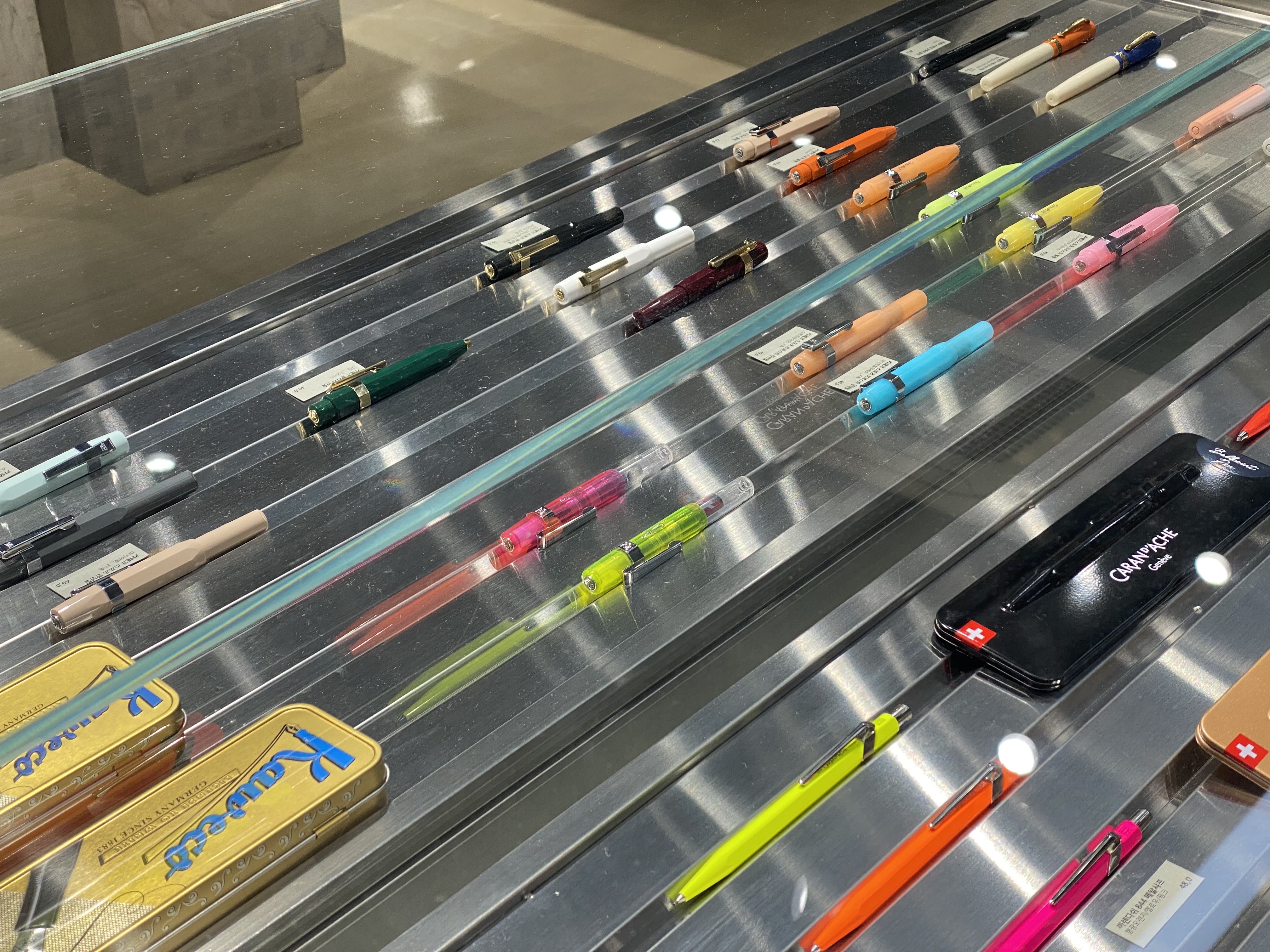 다양한 체험 공간을 소개해 드리기에 앞서 모나미에는 생각보다 다양한 형태의 제품들이 출시되고 있어요. 기존 알고 있던 검정, 파랑, 빨강의 3가지 색상으로 출시된 모나미 볼펜 말고도 만년필, 샤프, 잉크 펜, 형광펜 등 다양한 문구류를 판매하는 곳으로 상당히 확장되어 있더라고요. 눈길을 가장 사로잡았던 곳인데, 모나미 볼펜을 구성하는 헤드와 몸통, 잉크의 색, 그리고 볼펜 클립, 스프링까지 내가 원하는 색 조합으로 직접 껴서 구매할 수 있는 체험존이었어요. 이 글을 읽는 분들 중 문구 덕후가 계시다면 꼭 가봐야 할 장소로 추천드립니다!