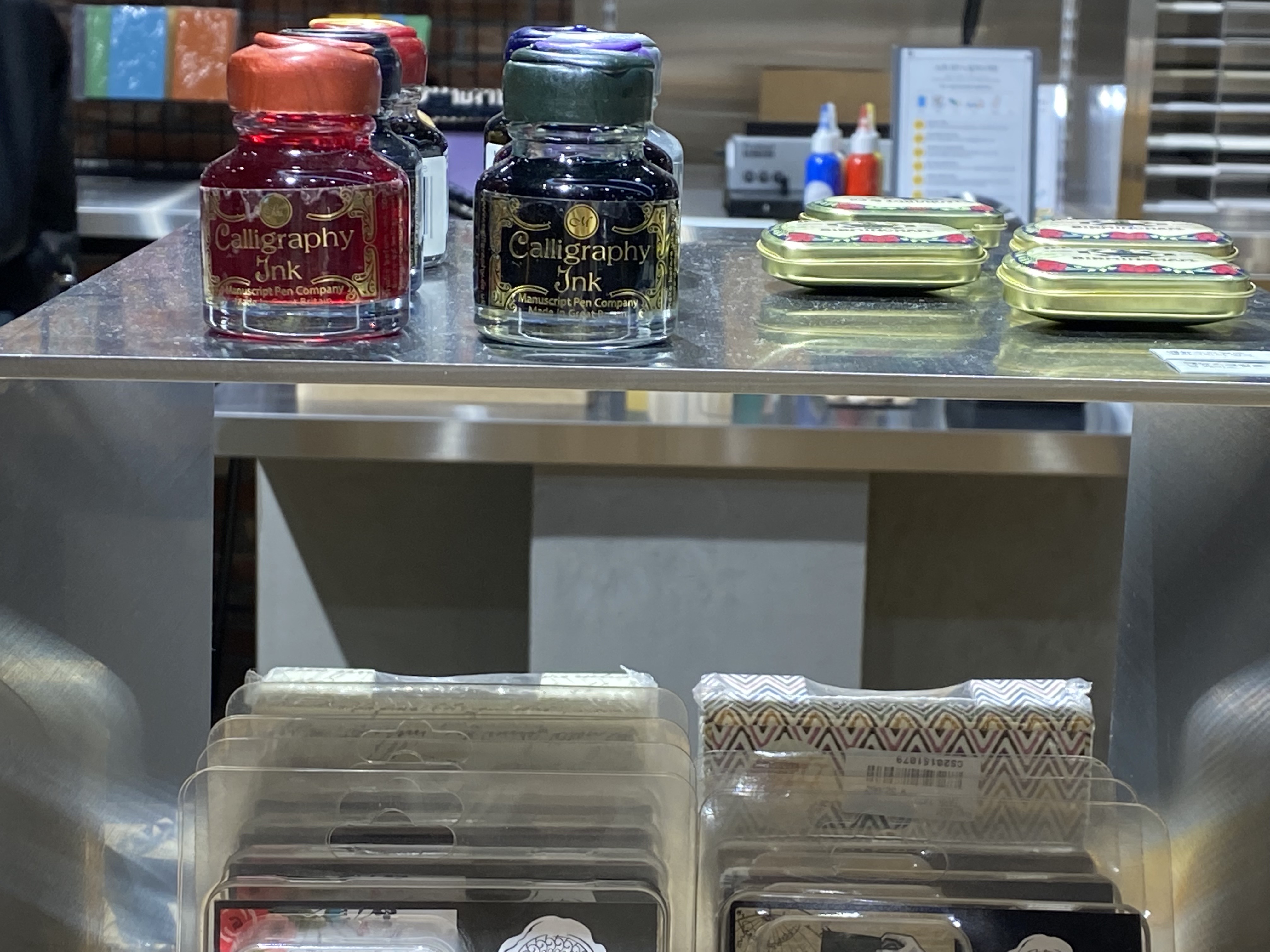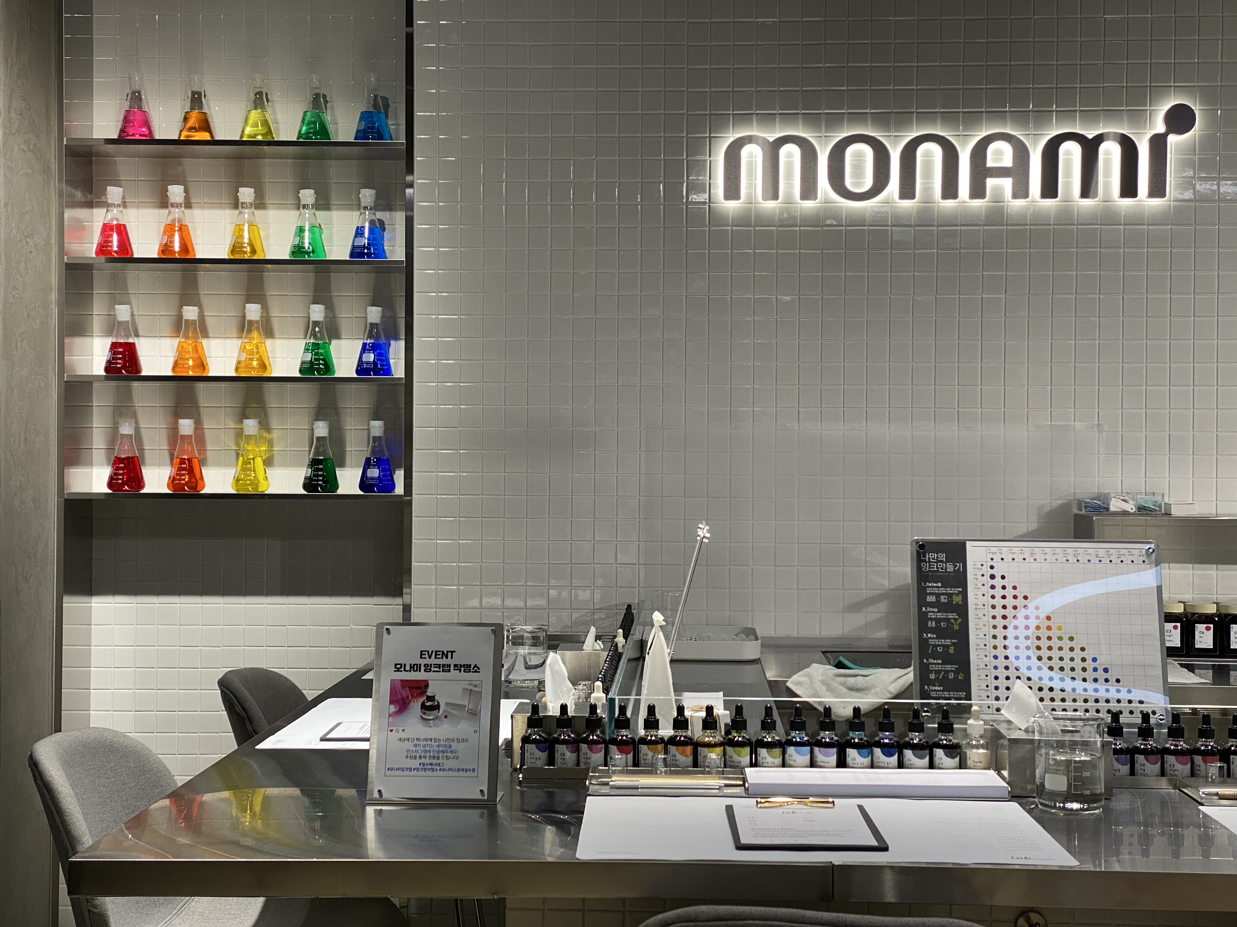 모나미 스토어만의 특별한 체험에 중 하나인 모나미의 ‘잉크랩’입니다. 잉크랩은 인당 25,000원의 가격으로 나만의 잉크 컬러를 만들 수 있는 클래스예요. 반드시 사전 예약 후에 이용해야 하기 때문에 공식 홈페이지에서 미리 일정을 확인하고 예약을 한 후에 방문하시는 것을 권장드립니다. 당일 예약도 경우에 따라 가능하긴 하지만, 당일 예약이 필요할 때에는 모나미 스토어에 직접 전화하여 가능한지 파악한 뒤, 예약이 가능하다고 해요.