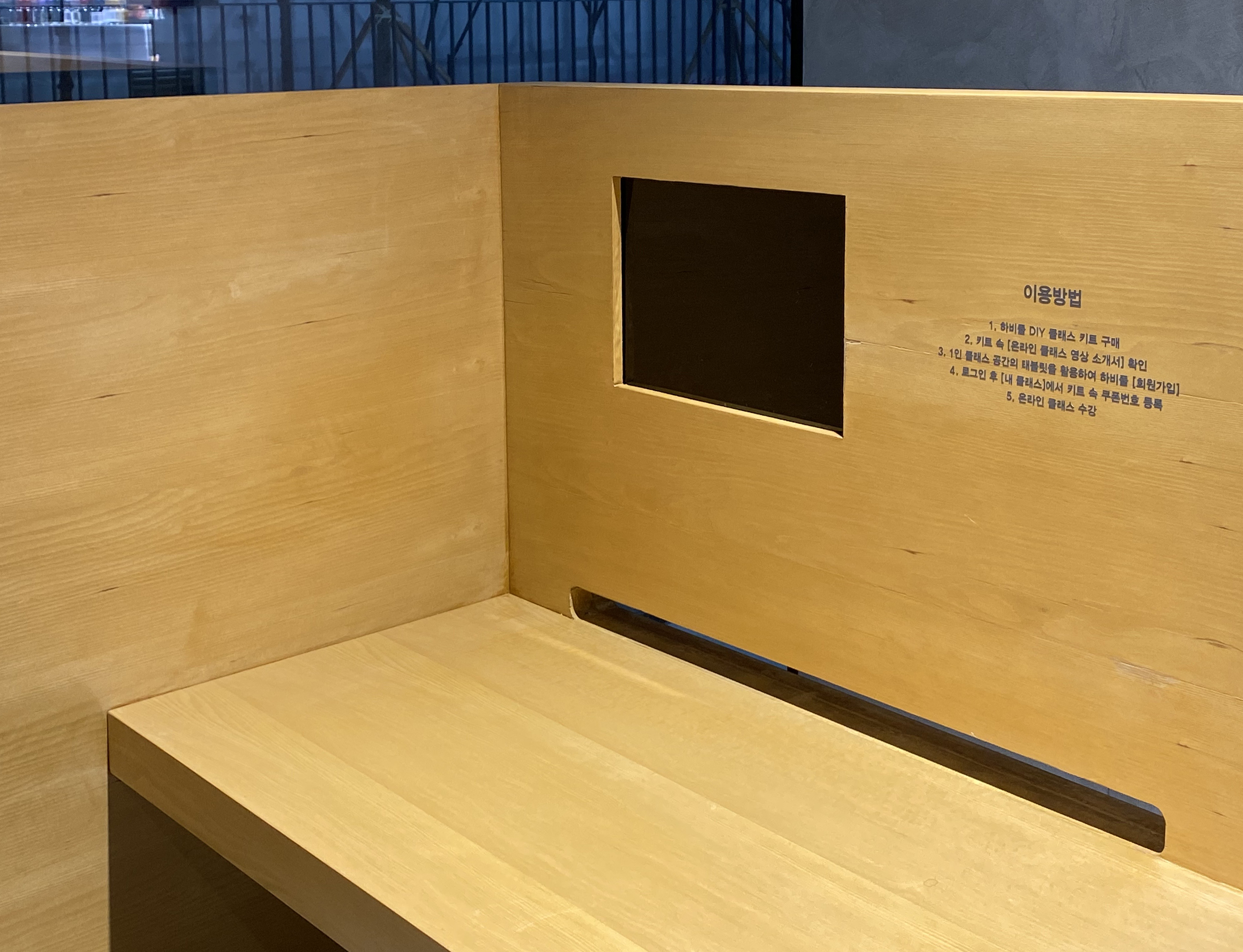 모나미 스토어 성수에는 독서실 같은? 혼자만의 책상이 있어서 이곳은 뭐 하는 곳일까 궁금해 살펴봤는데요. 온라인 사이트에서 DIY 클래스 키트를 구매하면 이 공간에서 영상을 보고 온라인 클래스를 수강하며 키트를 이용할 수 있는 하비 풀이라는 공간이라고 합니다. 앞서 소개한 노트 DIY나 다이어리 DIY 키트 등 모나미에 준비된 DIY 키트들을 만들고 가는 분들도 있다고 하더라고요. 키트도 구매해서 취미 생활을 하는 것도 좋을 것 같아요!